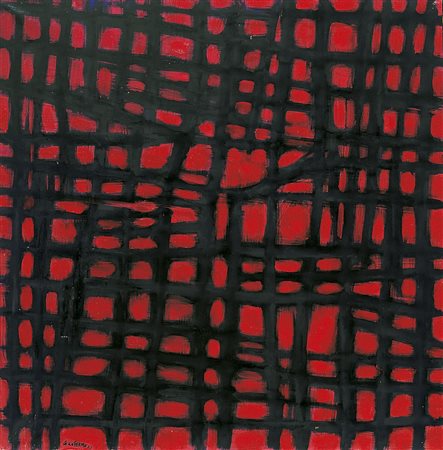 olio su tela cm. 100x100x1,5; firma e anno in basso a sinistra, certificato di autenticità della Accademia Internazionale di Arte Moderna (Roma) al retro, dichiarazione d'autenticità dell'artista e timbri della Galleria Studio DR (Roma) e della Galleria Spazio Visivo (Roma) dove l'opera è stata esposta, priva di cornice.