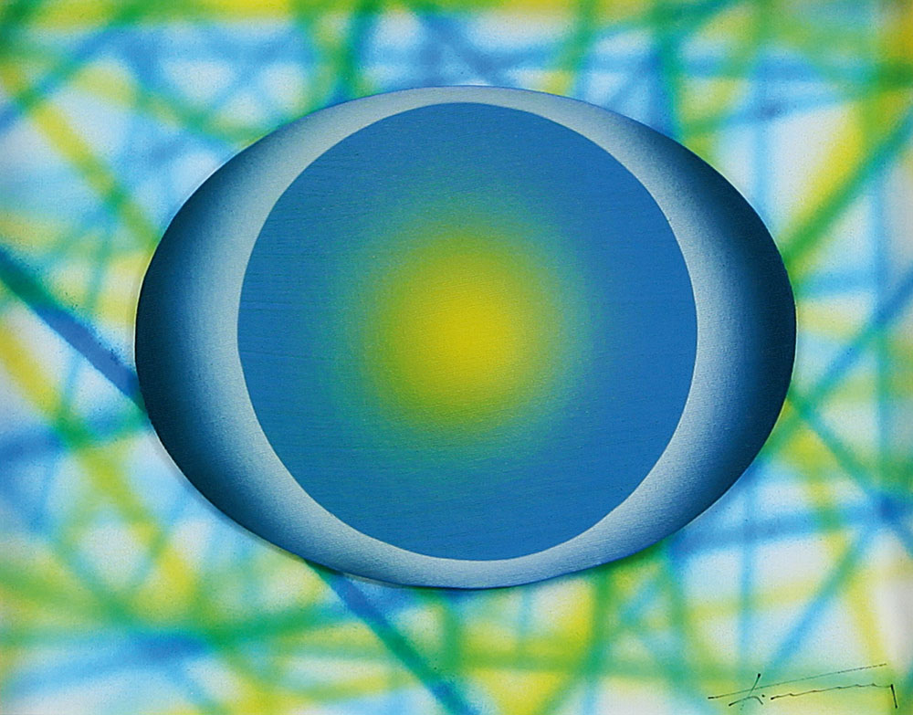 tecnica mista e aerografo su cartoncino telato ovale applicato su cartone aerografato cm. 28x35, firma, titolo e anno al retro, dichiarazione d'autenticità dell'artista su foto.