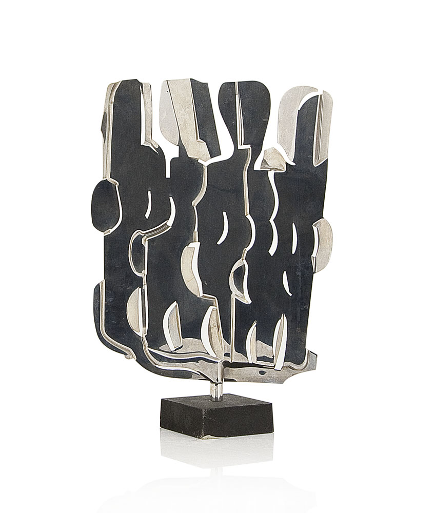 acciaio inossidabile (AISI 304) spessore mm 1,5, stampato e tranciato con pieghe e fenditure verticali e ruotante su perno centrale; la finitura è lucida riflettente. La base è in fusione di ghisa a finitura nera satinata misure cm. 42,5x29,5 peso kg 2.08, esemplare 336/1000, firma e tiratura in basso.