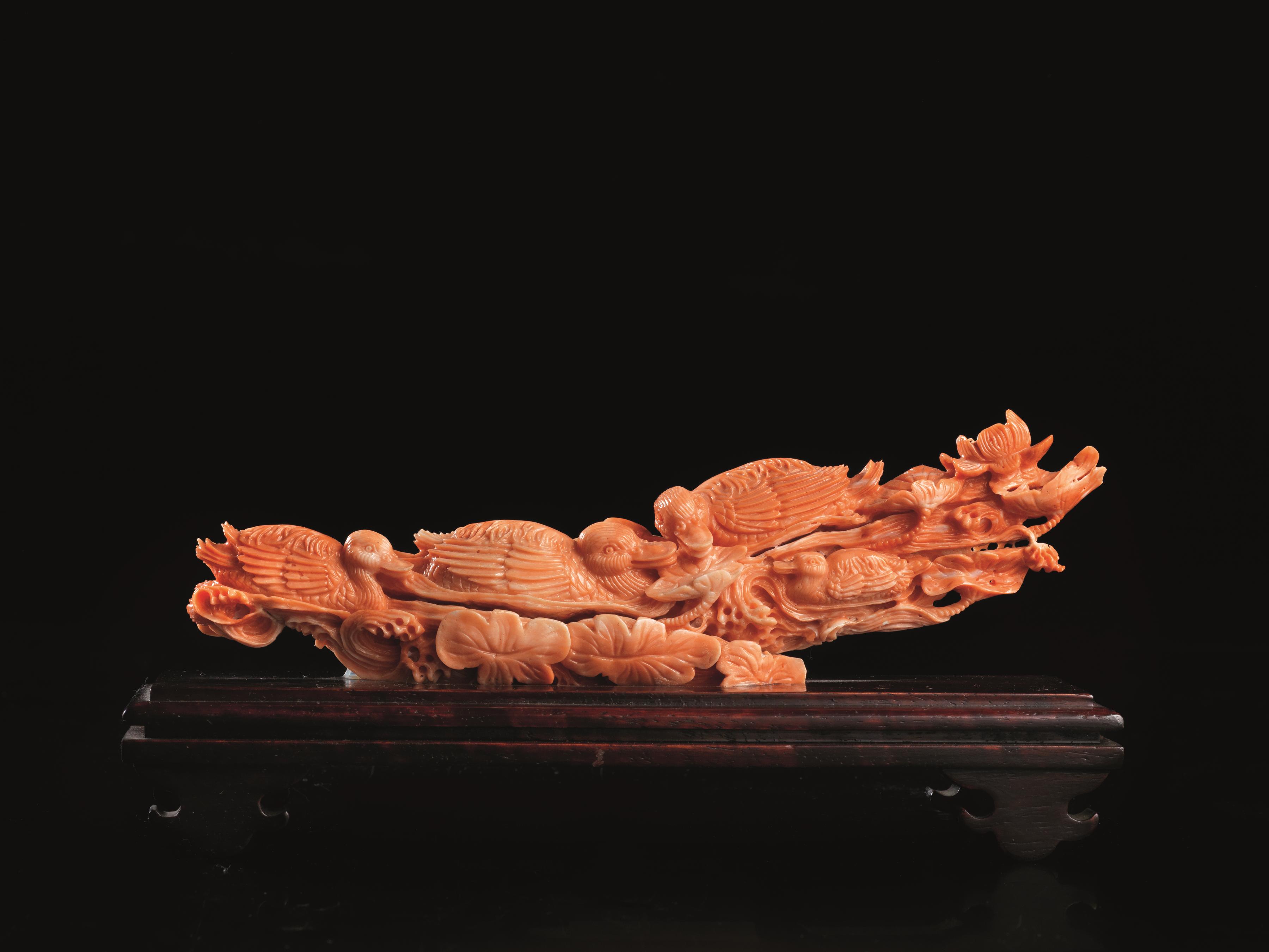 SCULTURA, CINA, SEC. XIX in corallo, finemente intagliato con tre papere tra...