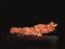 in corallo, finemente intagliato con tre papere tra racemi fioriti sul fronte, il retro decorato con pesci, lung. cm 18, poggiante su base in legno, gr. 269 inclusa la base