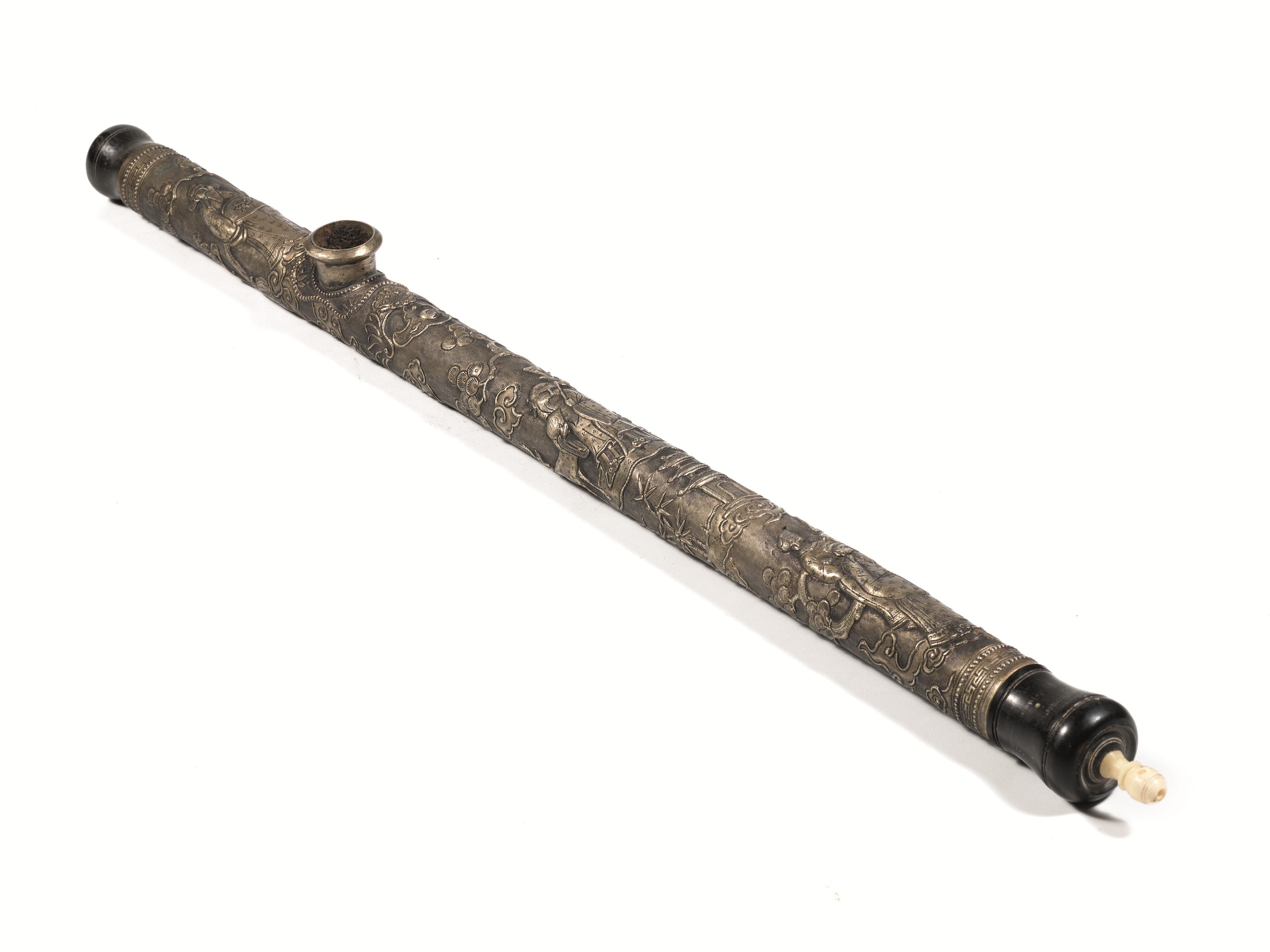 PIPA, CINA, SECC. XIX-XX in metallo argentato, incisa con personaggi e...