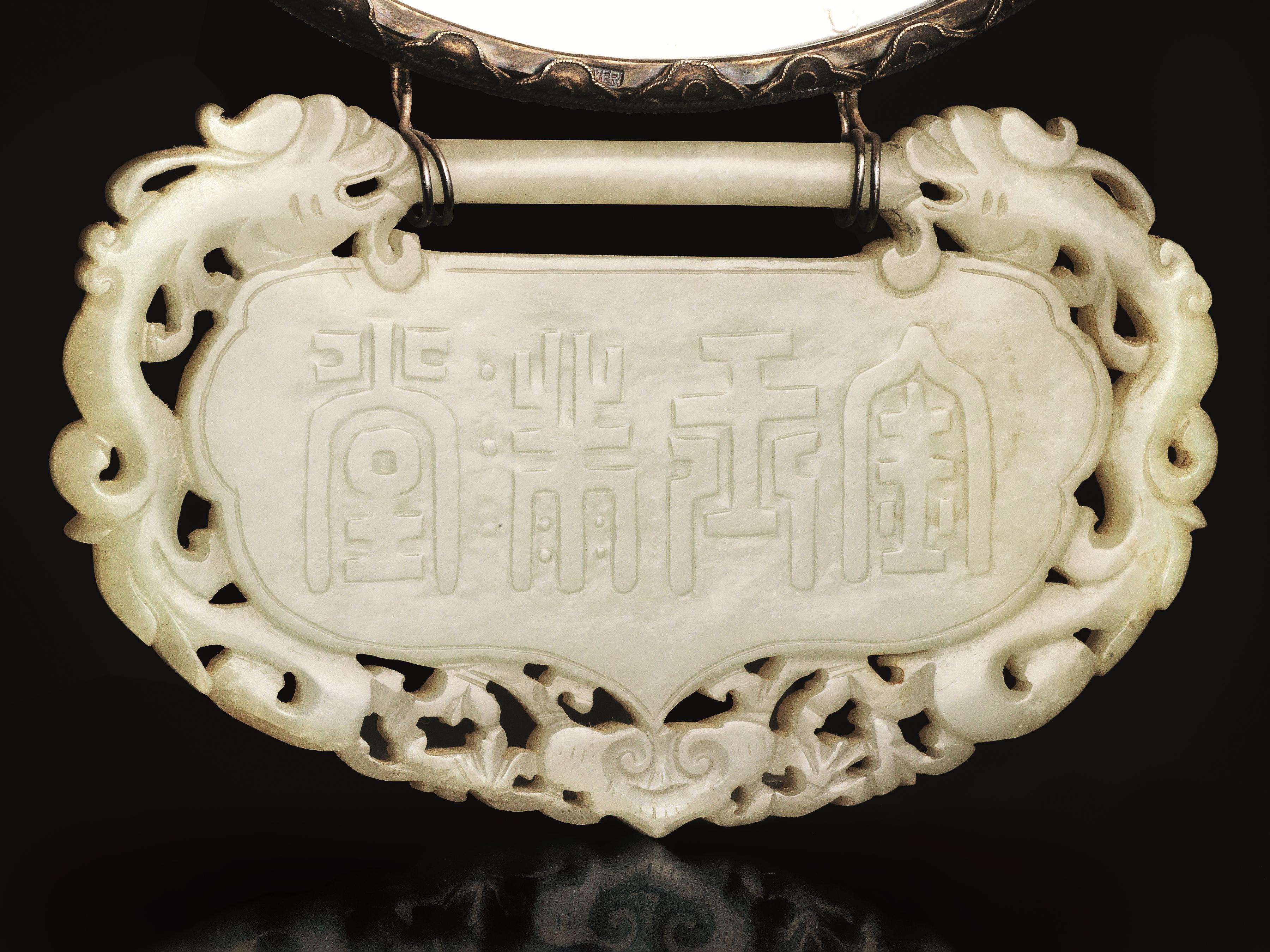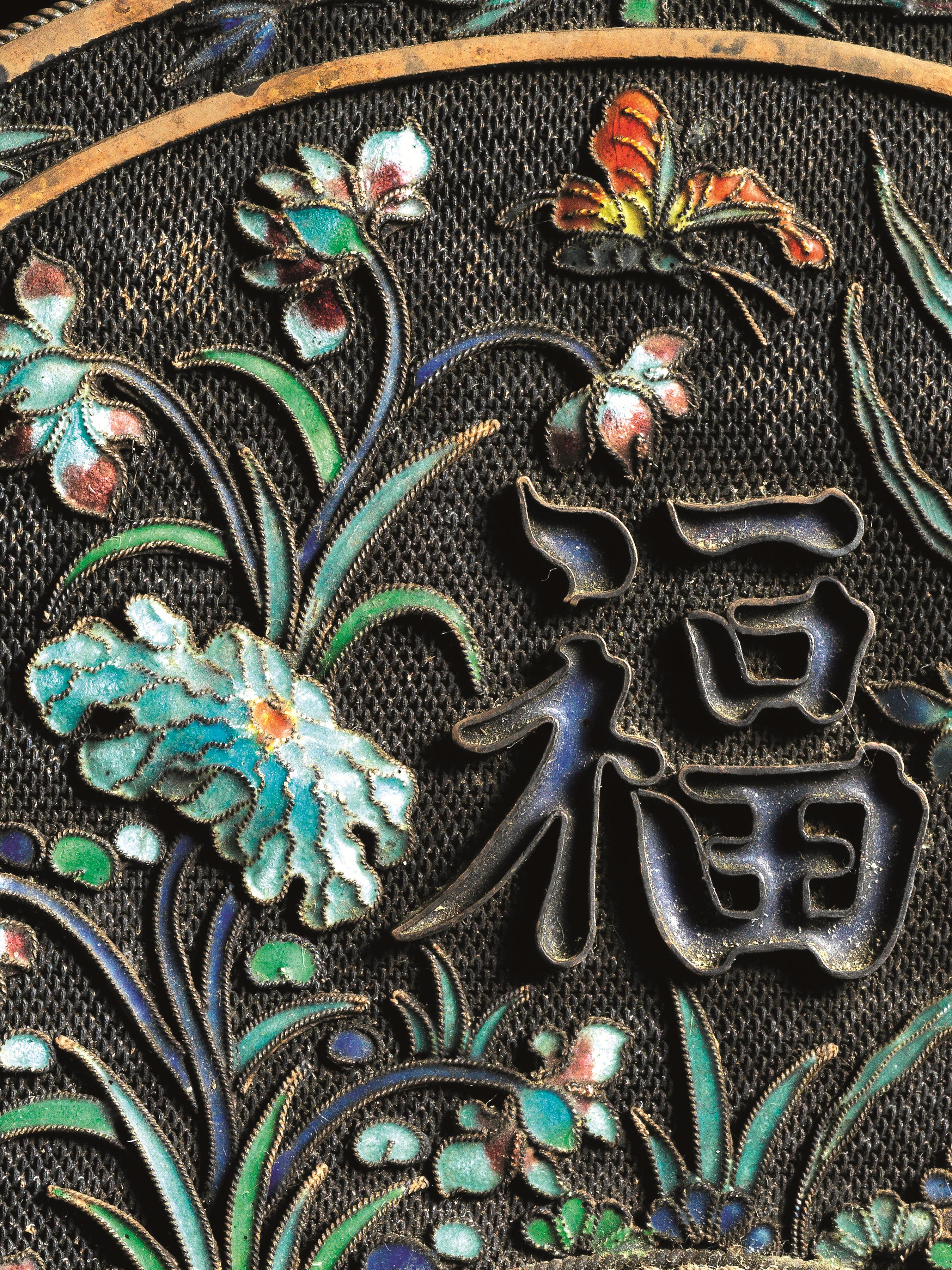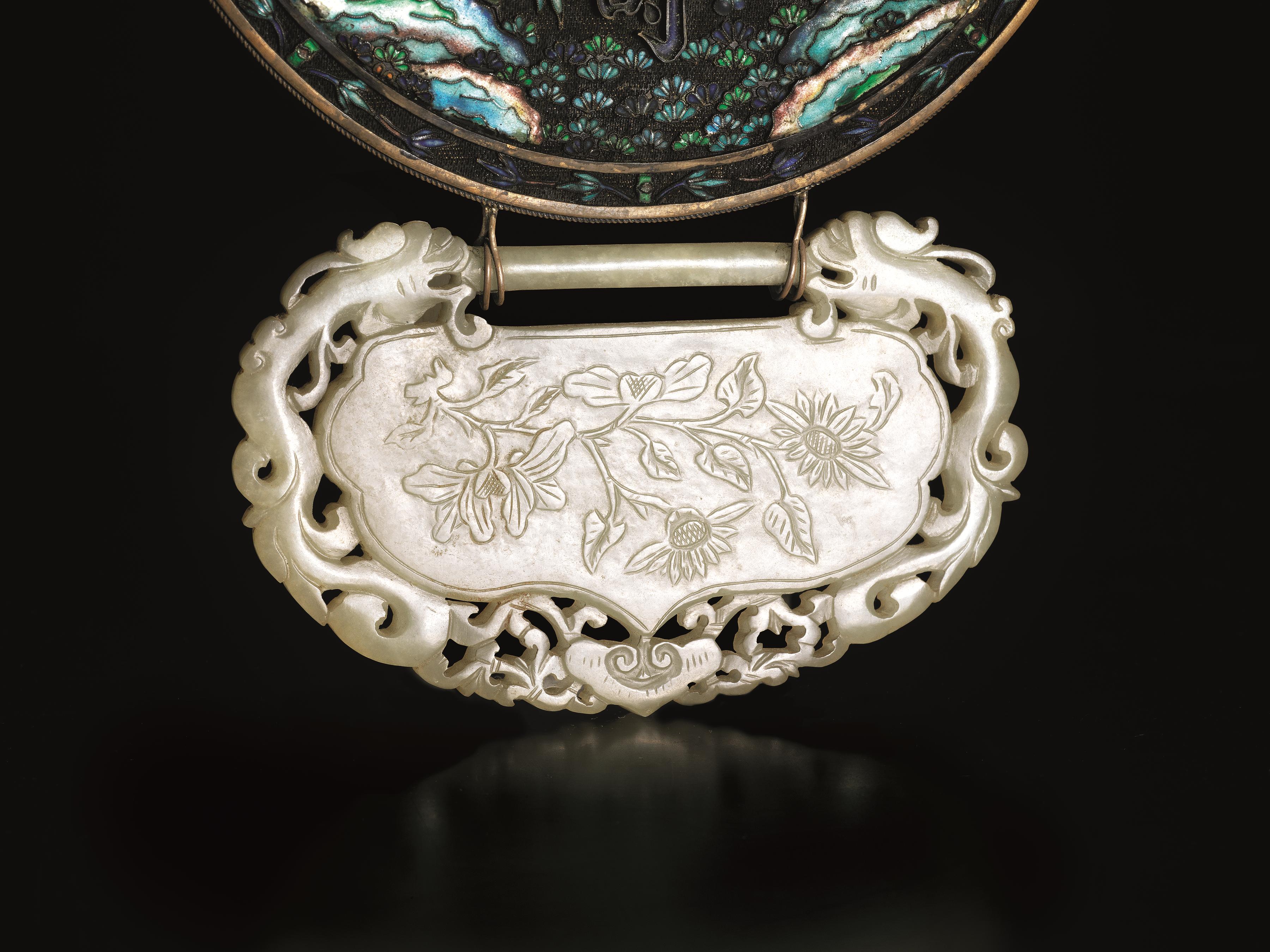 il retro in metallo smaltato , finemente decorato con motivi floreali e farfalle, al centro una placca in giada lavorata al traforo , sul fondo altro elemento in giada decorata con m otivi floreali da un lato e scritte dall' a l tro , alt. cm 30 , 5