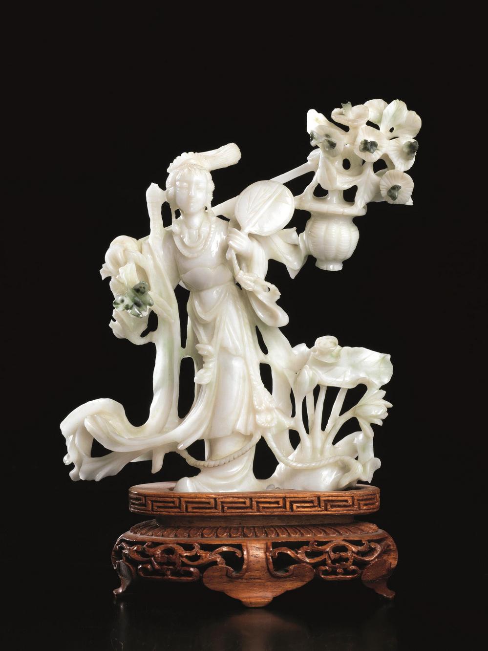 in giadeite, raffigurante Guanyin con vaso di fiori, alt. cm 13,5