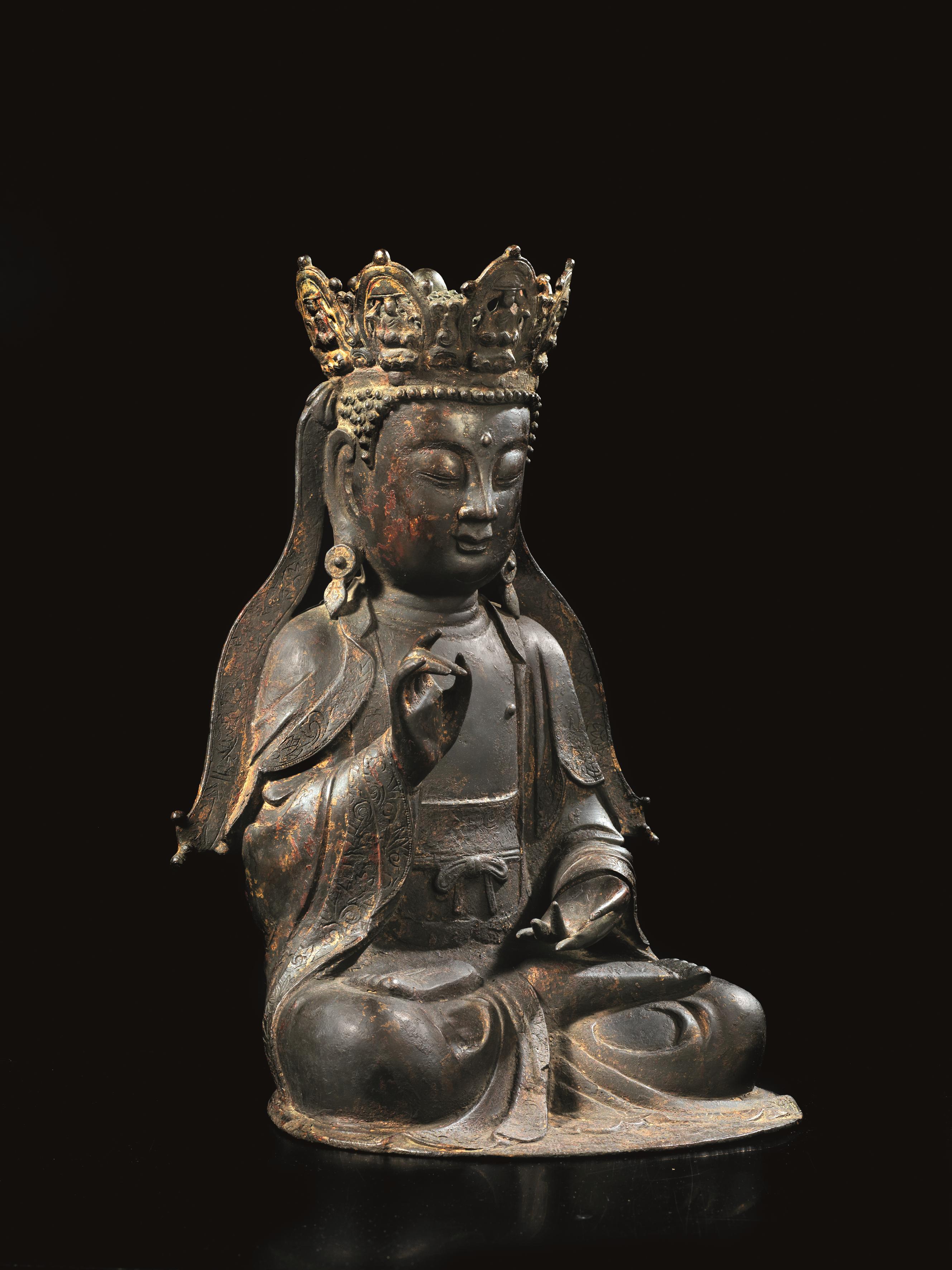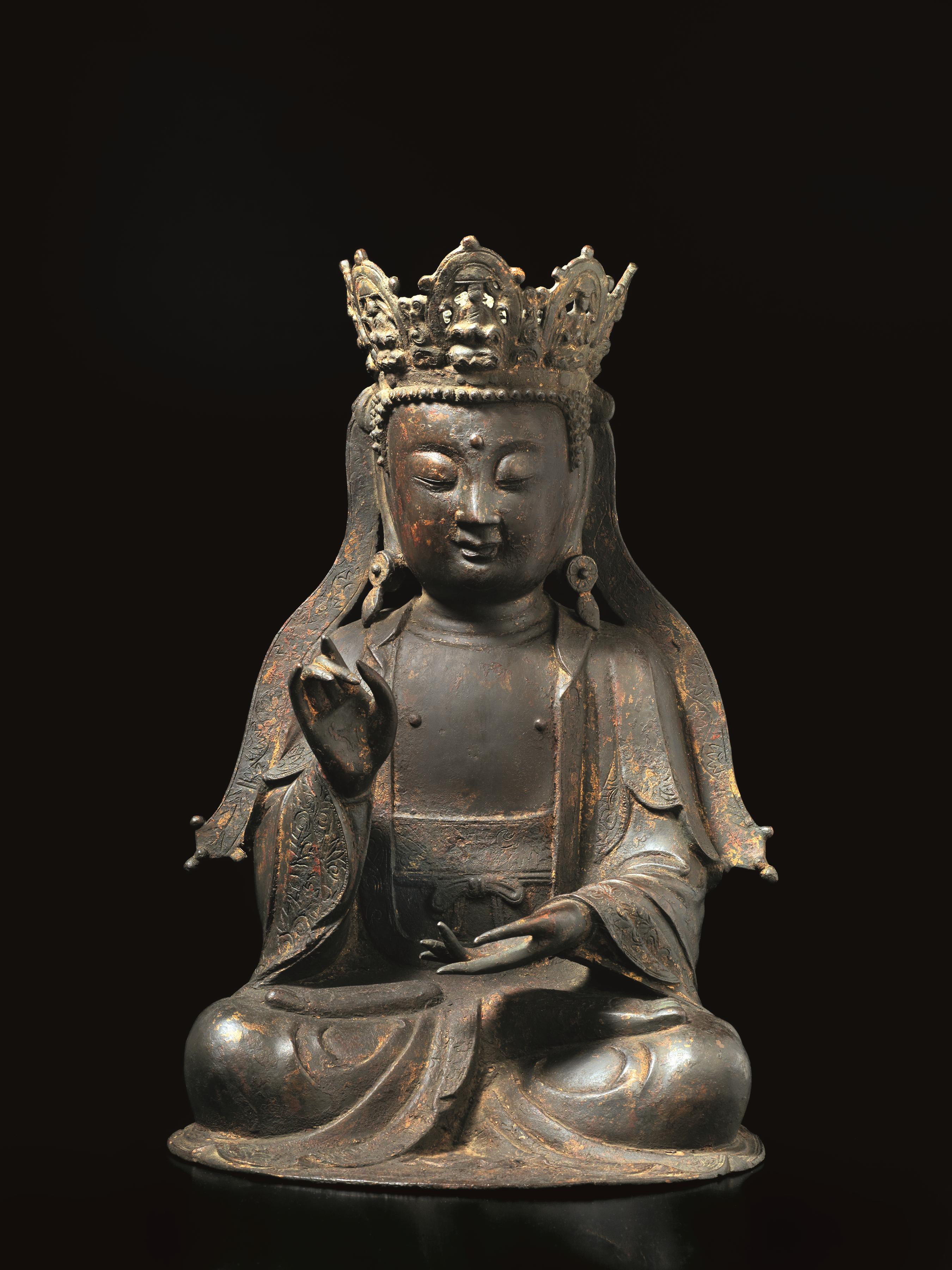 GUANYIN, CINA, TARDA DINASTIA MING in bronzo laccato con tracce di doratura,...