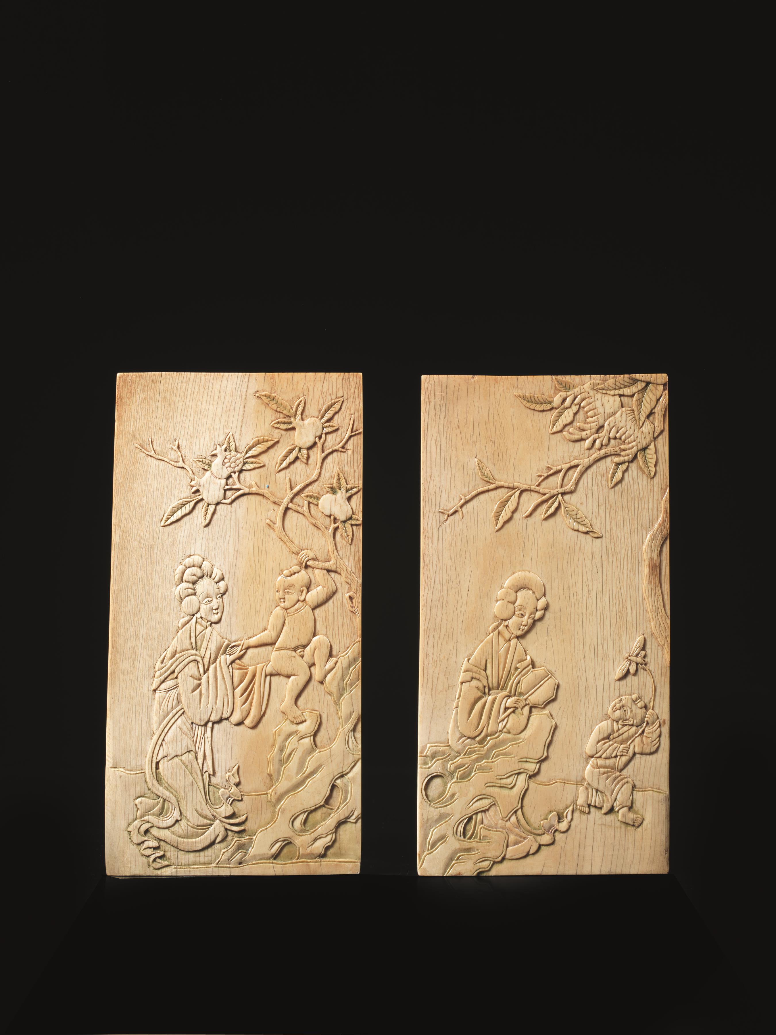 DUE PLACCHETTE, CINA, TARDA DINASTIA MING in avorio, decorato con figure in...