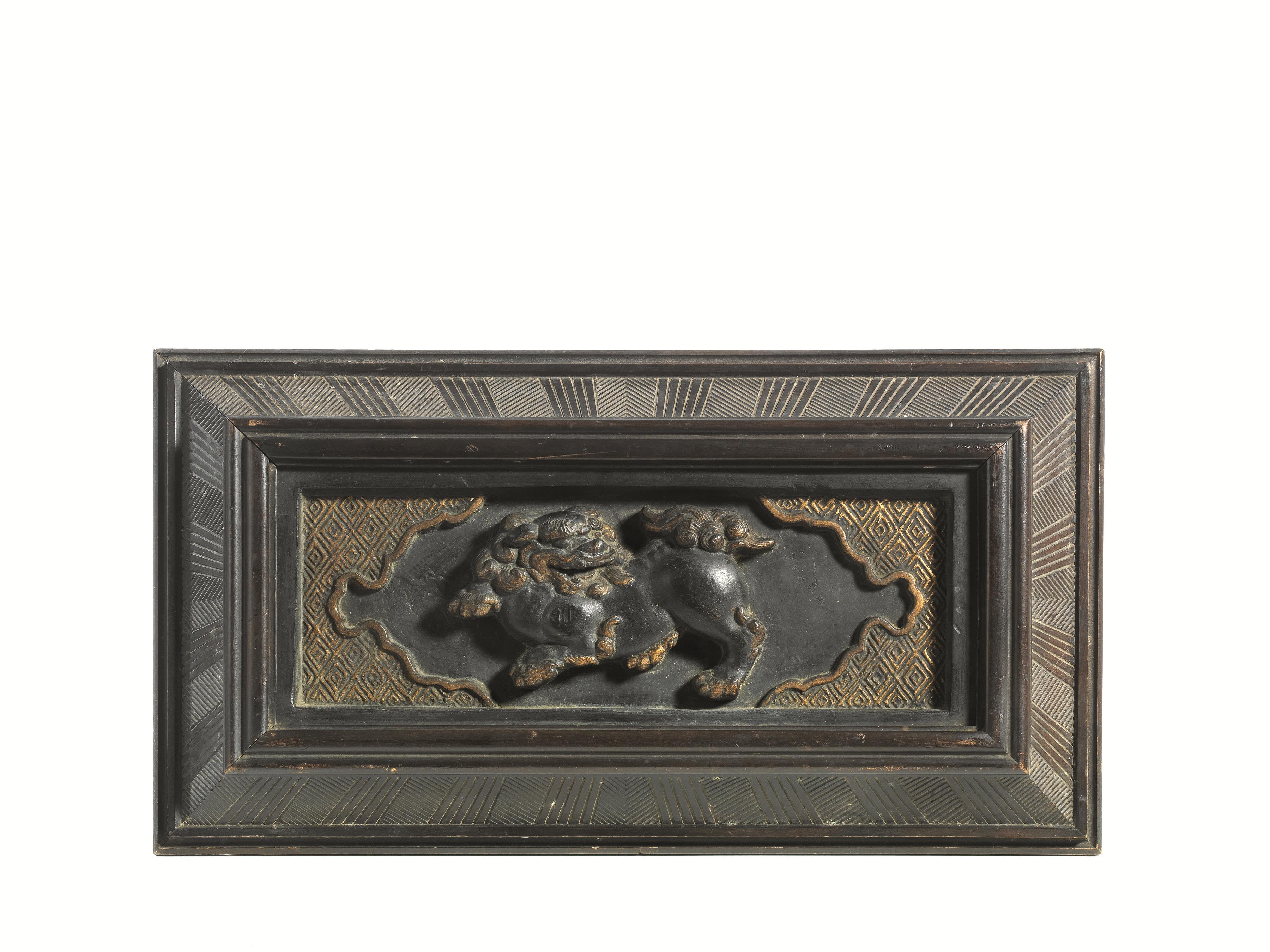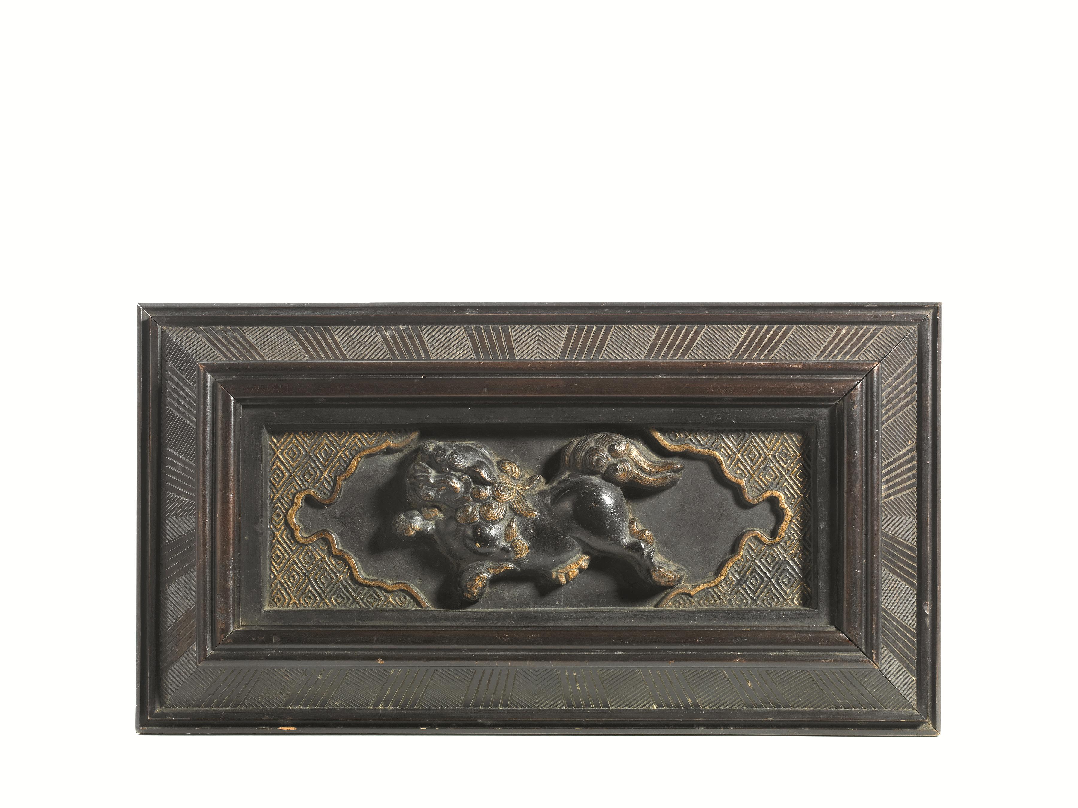 uno grande e due piccoli in bronzo entro cornice in legno, decorati con Qilin, cm 69x54 e cm 13x38,5 (3)