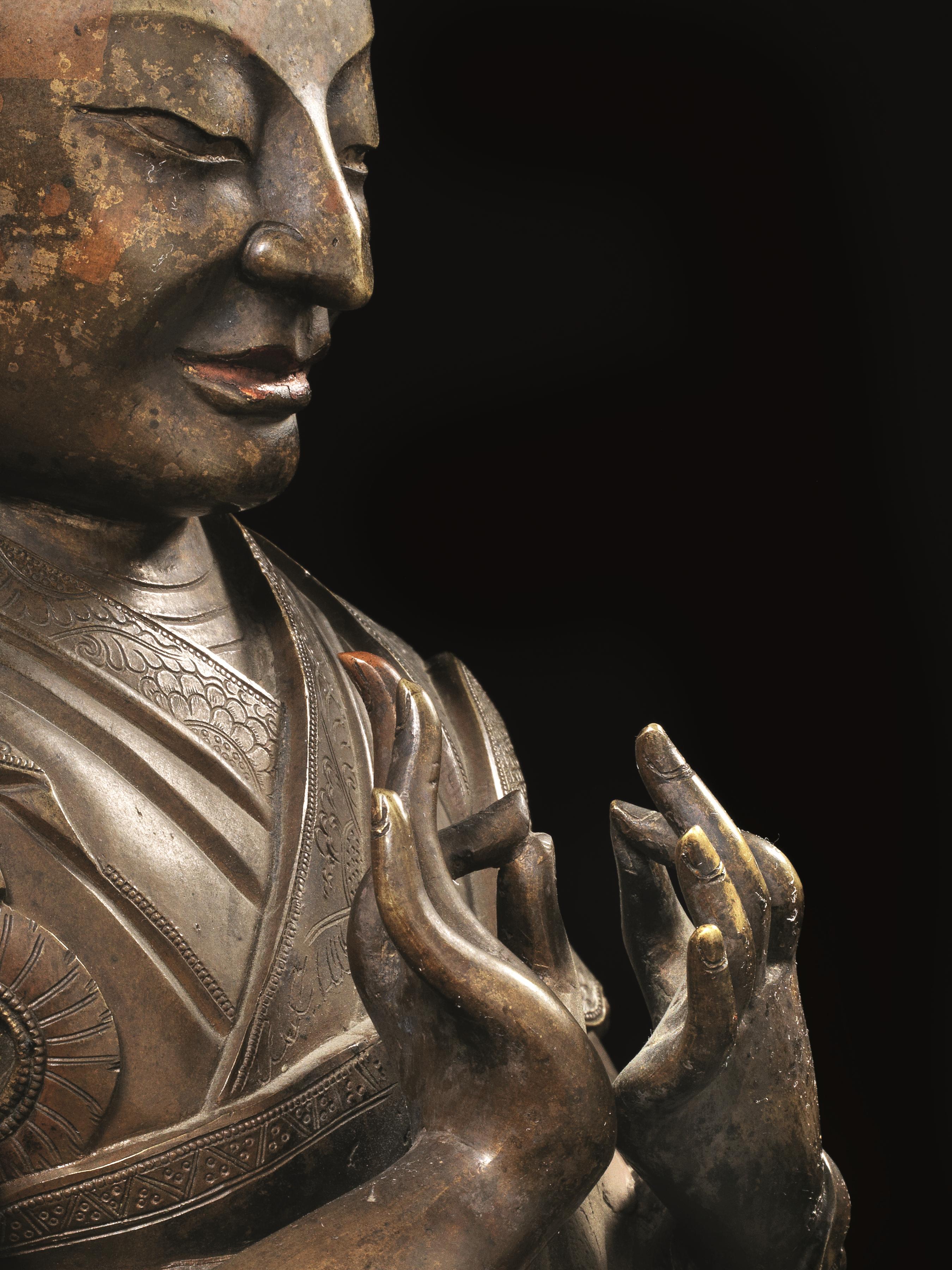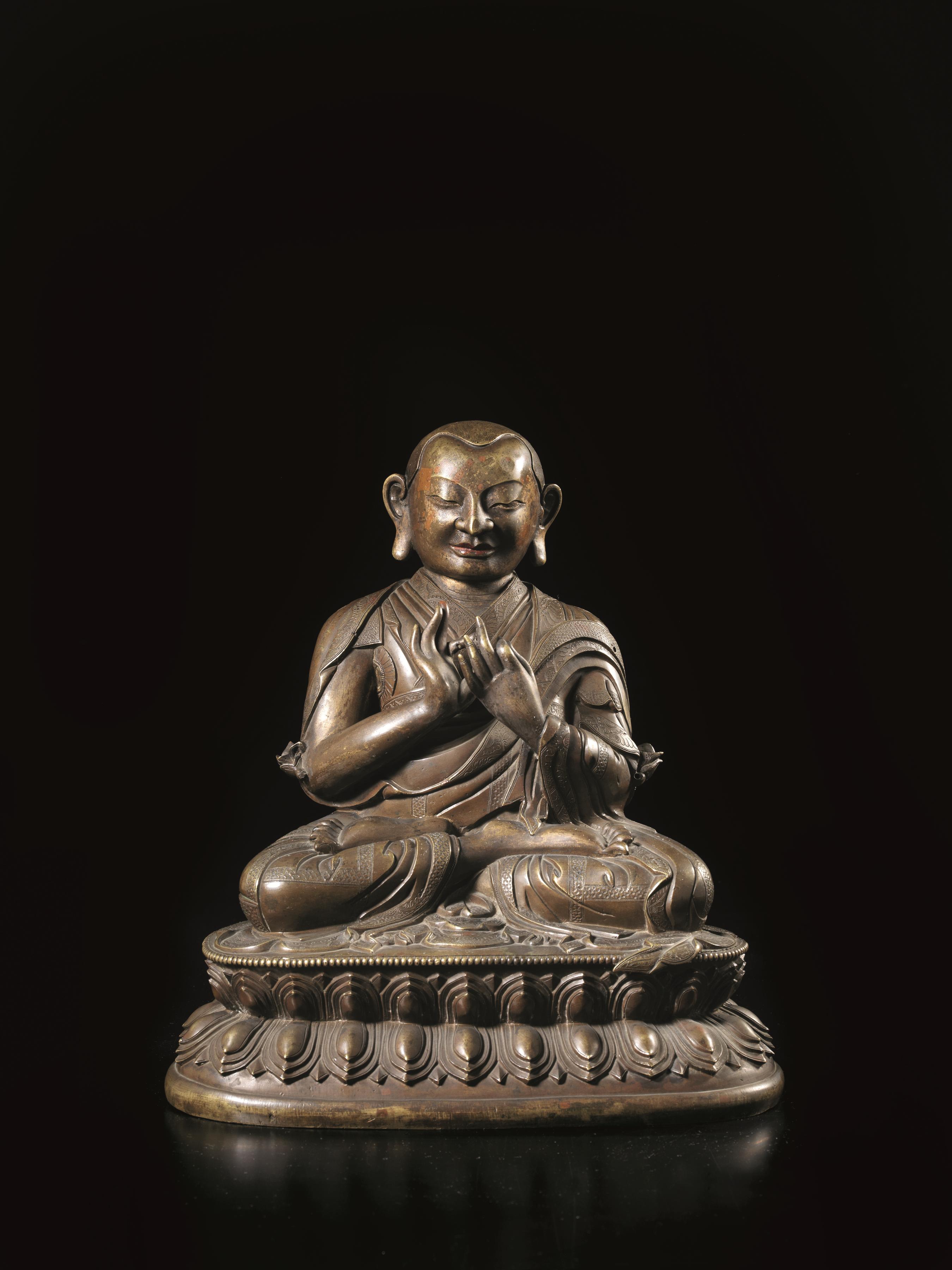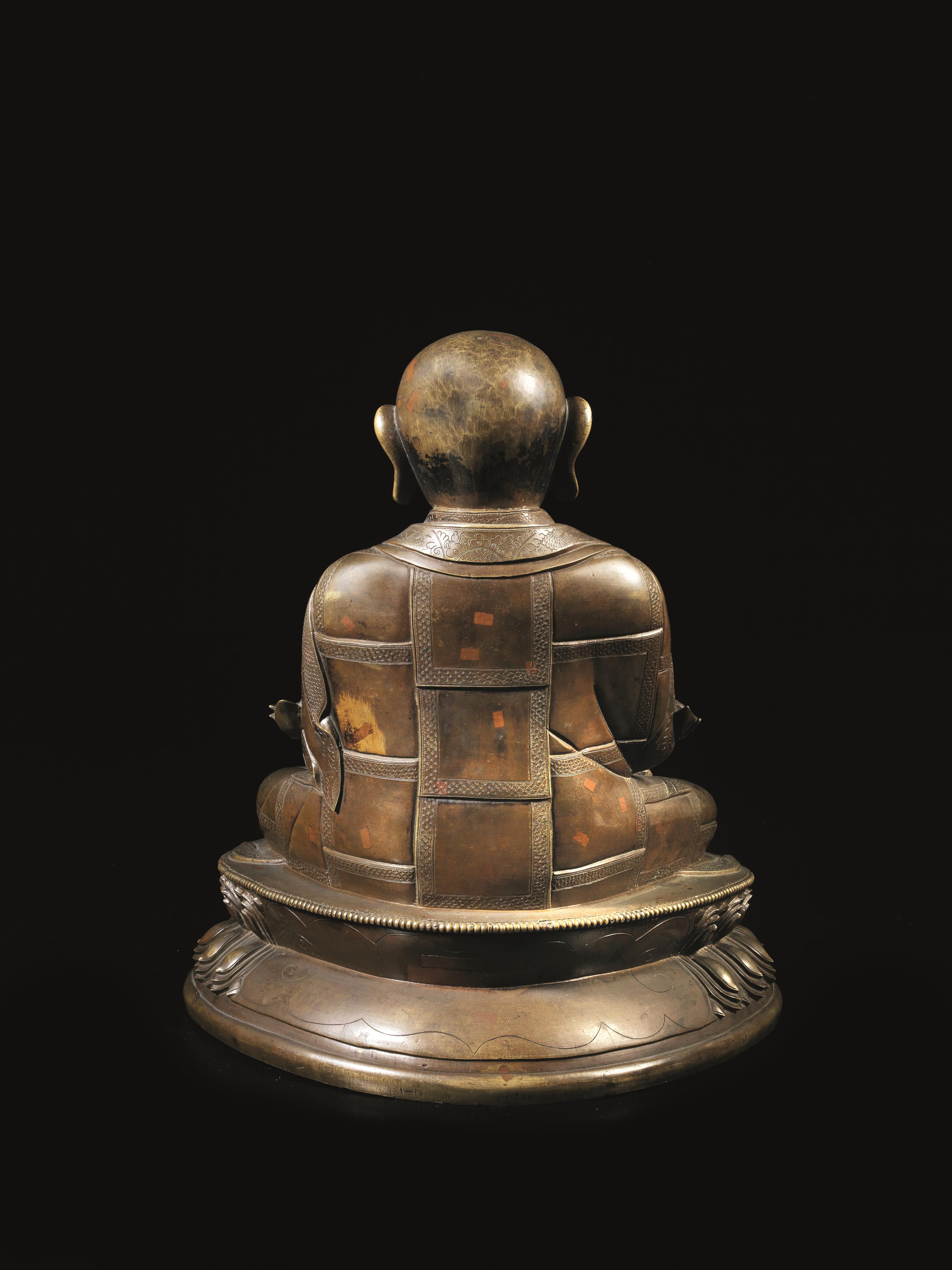 in bronzo con tracce di doratura, raffigurante Lama assiso in dhyanasana su doppia base a fior di loto in dharmachakramudra, le vesti finemente cesellate con fiori e motivi geometrici, alt. cm 32