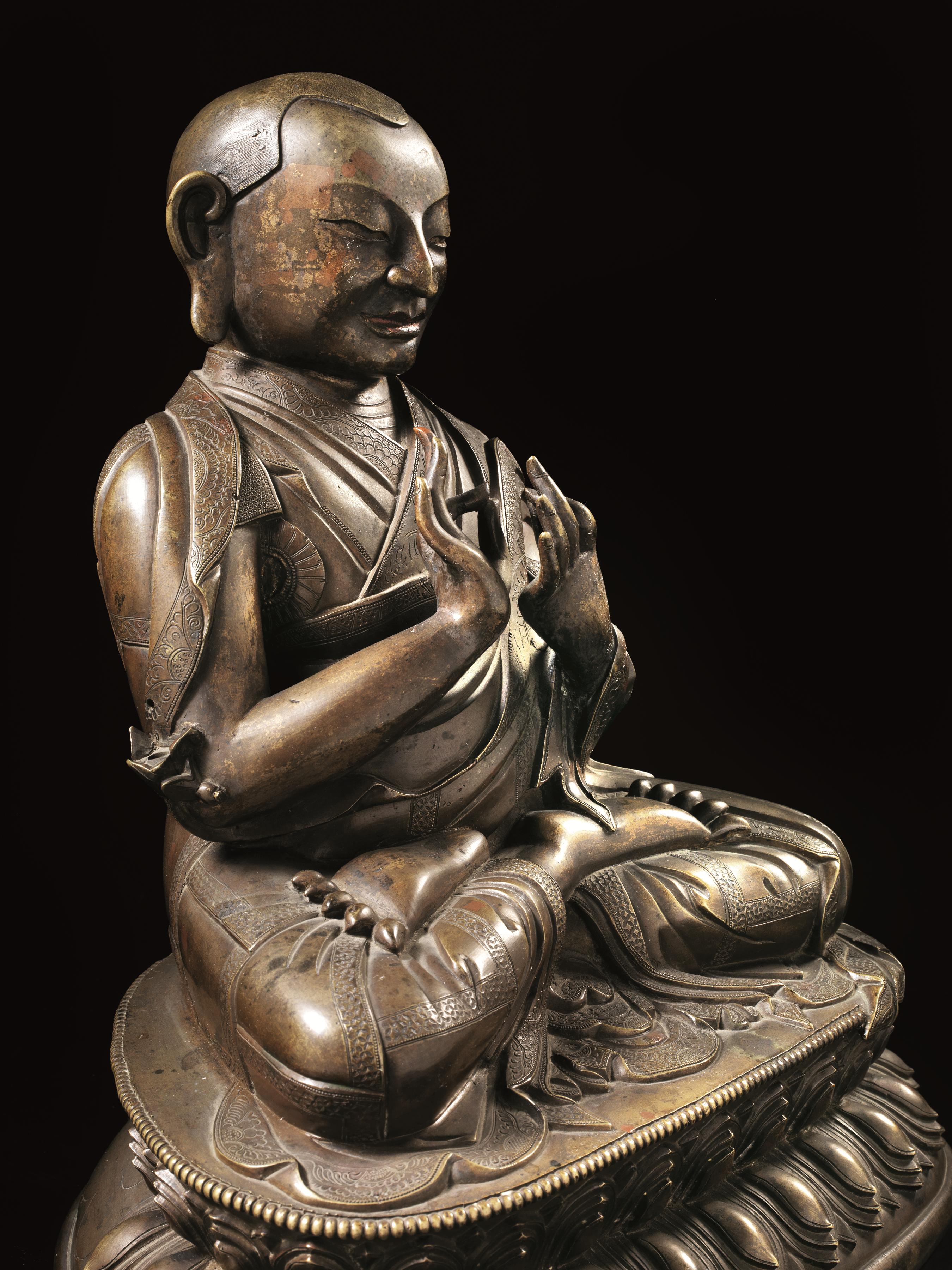 A Sino-Tibetan bronze with partial gilt figure of a Lama, 18th century Qianlong period (1736-1795)