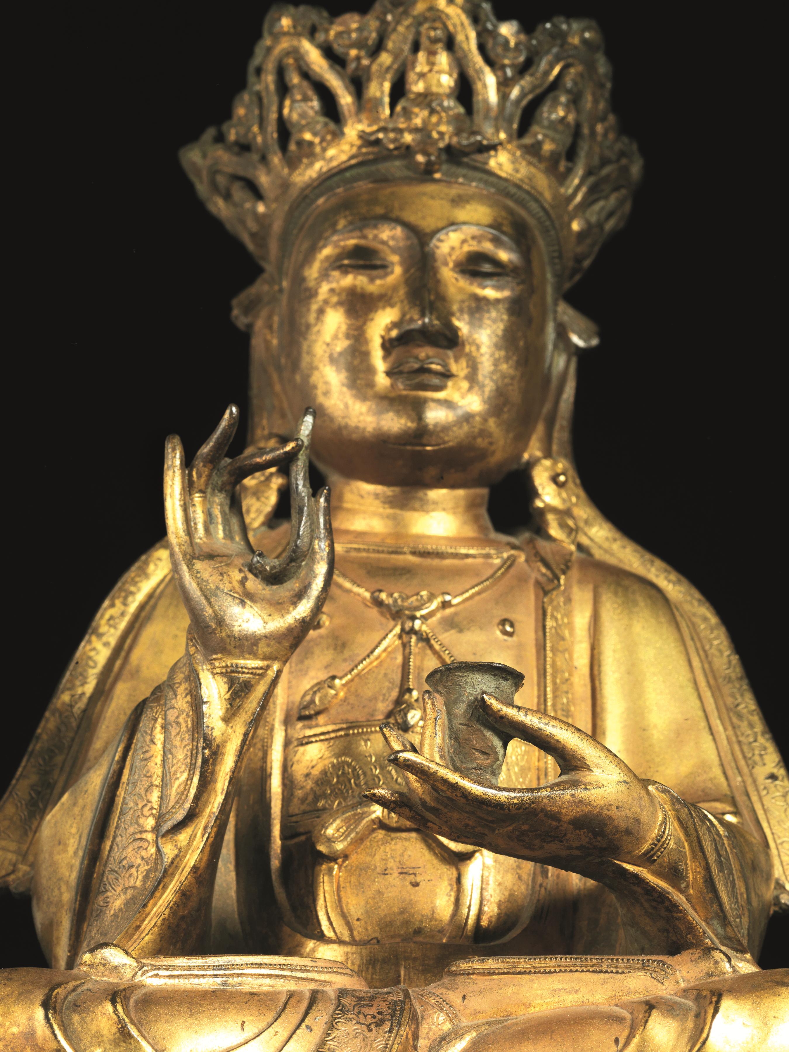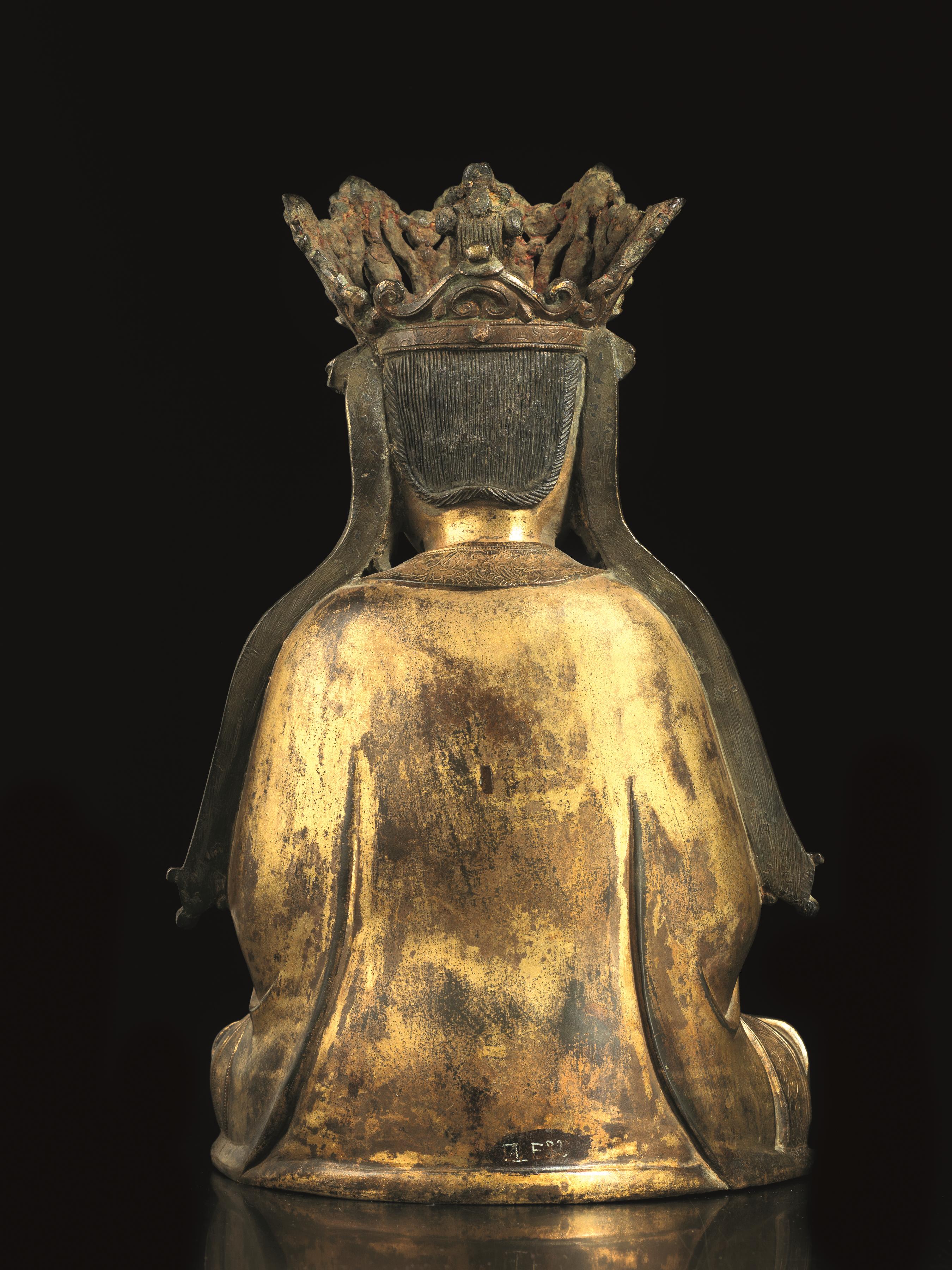 in bronzo dorato, raffigurante Gaunyin assisa in dhyanasana, la mano destra regge un ramoscello di salice e la sinistra una coppa; il volto, con espressione contemplativa, è sormontato da una elaborata corona a più punte, il bhodistva elegantemente vestito con una morbida veste fluente con un bordo floreale cesellato, alt. cm 34