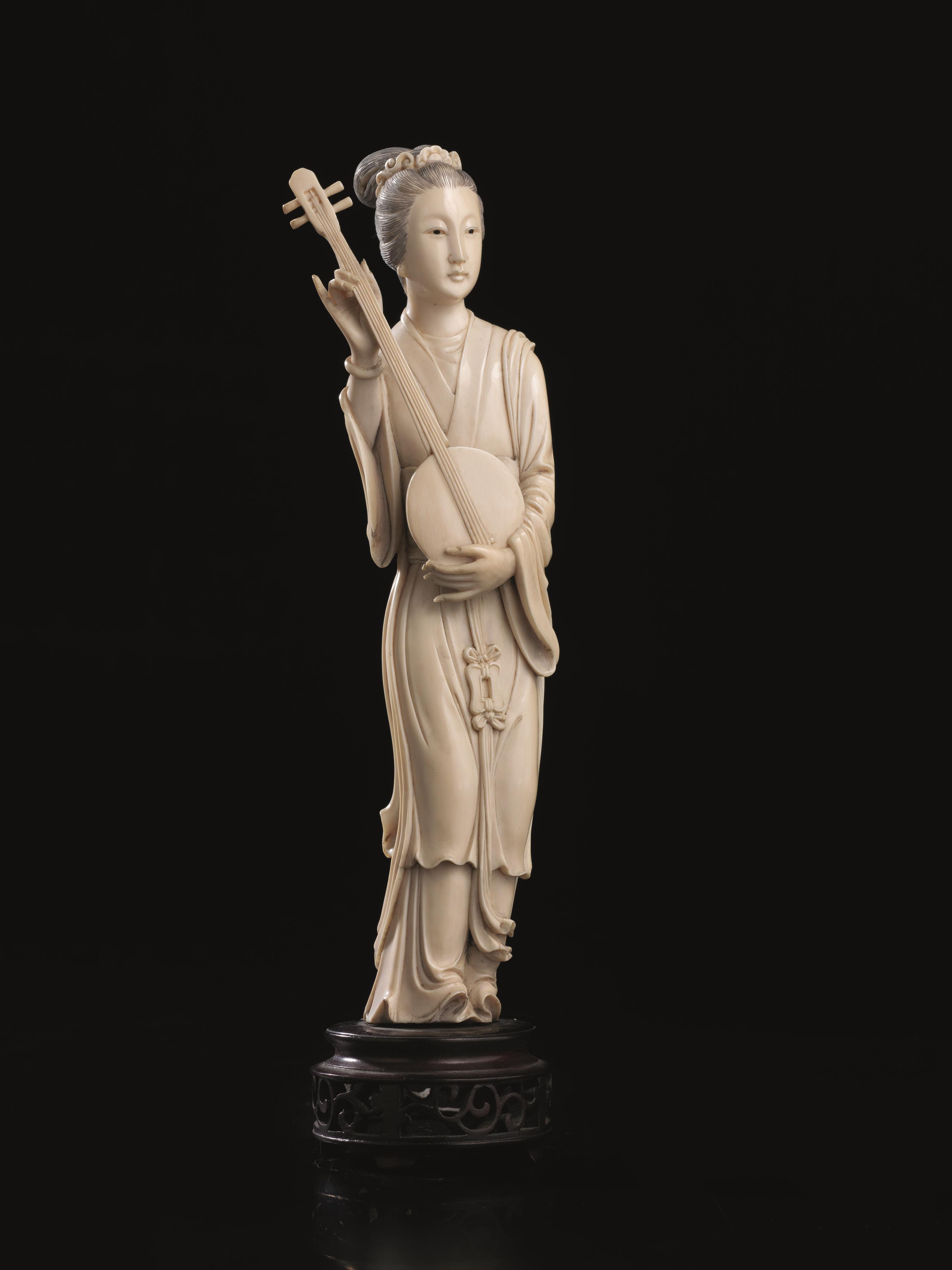 in avorio, modellato nella forma di figura femminile con strumento musicale, alt. cm 25,5, poggiante su base in legno