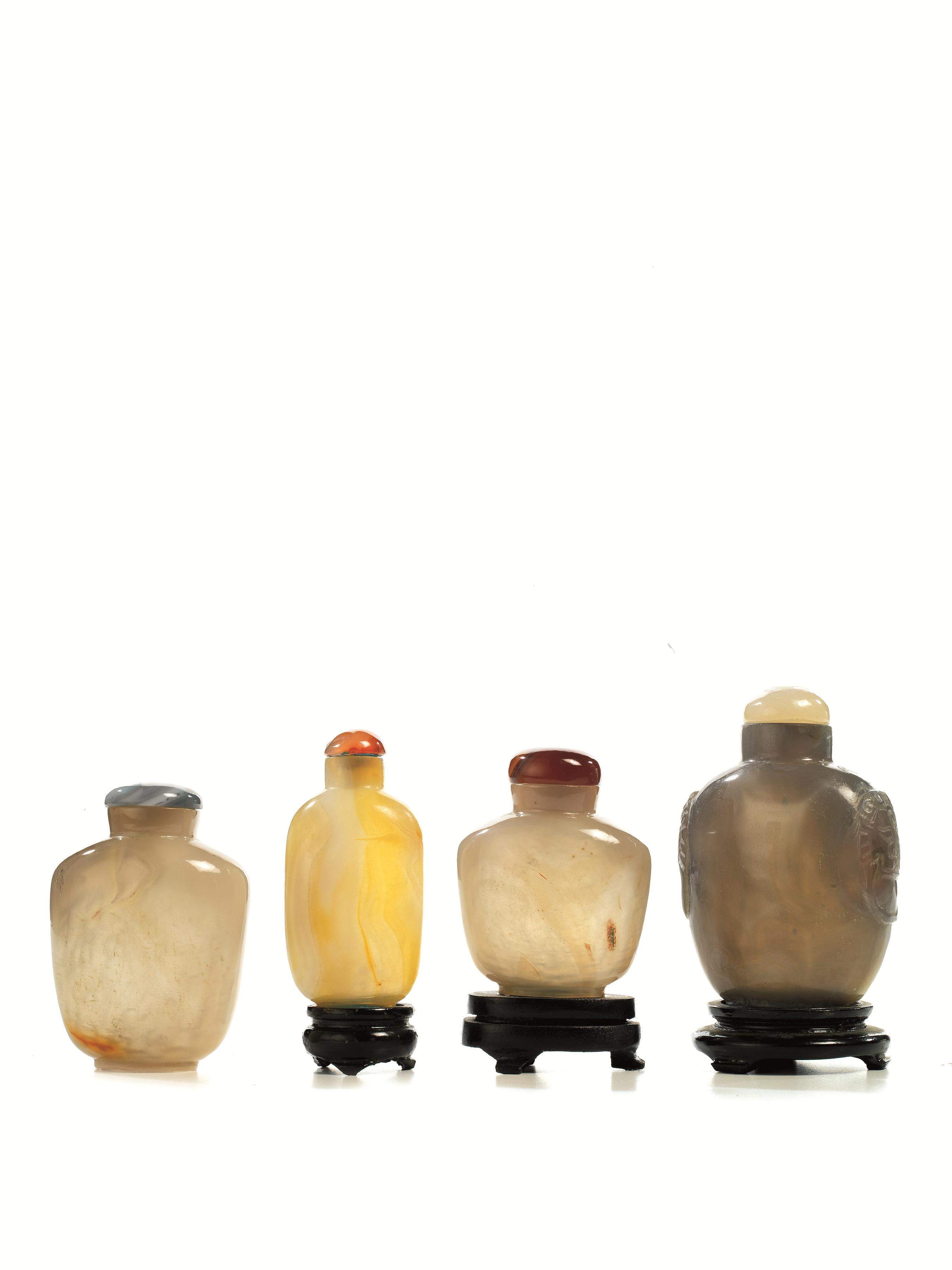 DUE SNUFF BOTTLES, CINA, SEC. XIX in agata, alt. cm 7,5, alt. cm 7, una...