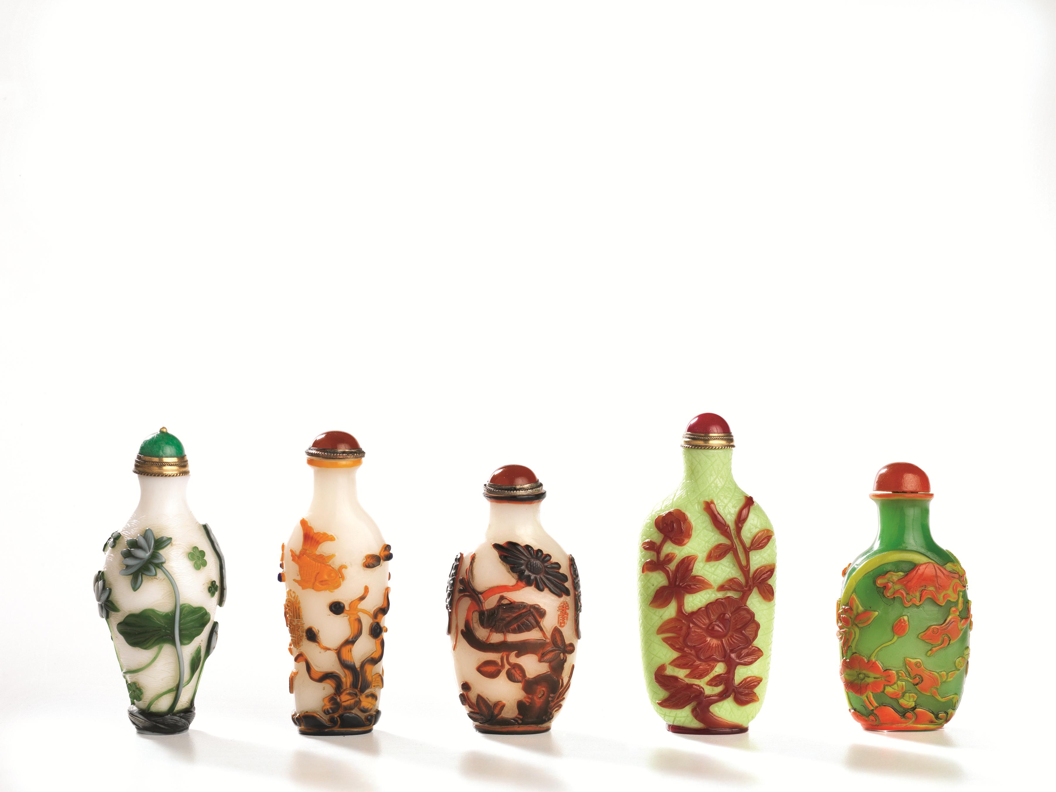 CINQUE SNUFF BOTTLES, CINA, SECC. XIX-XX in vetro incamiciato, decorate con...