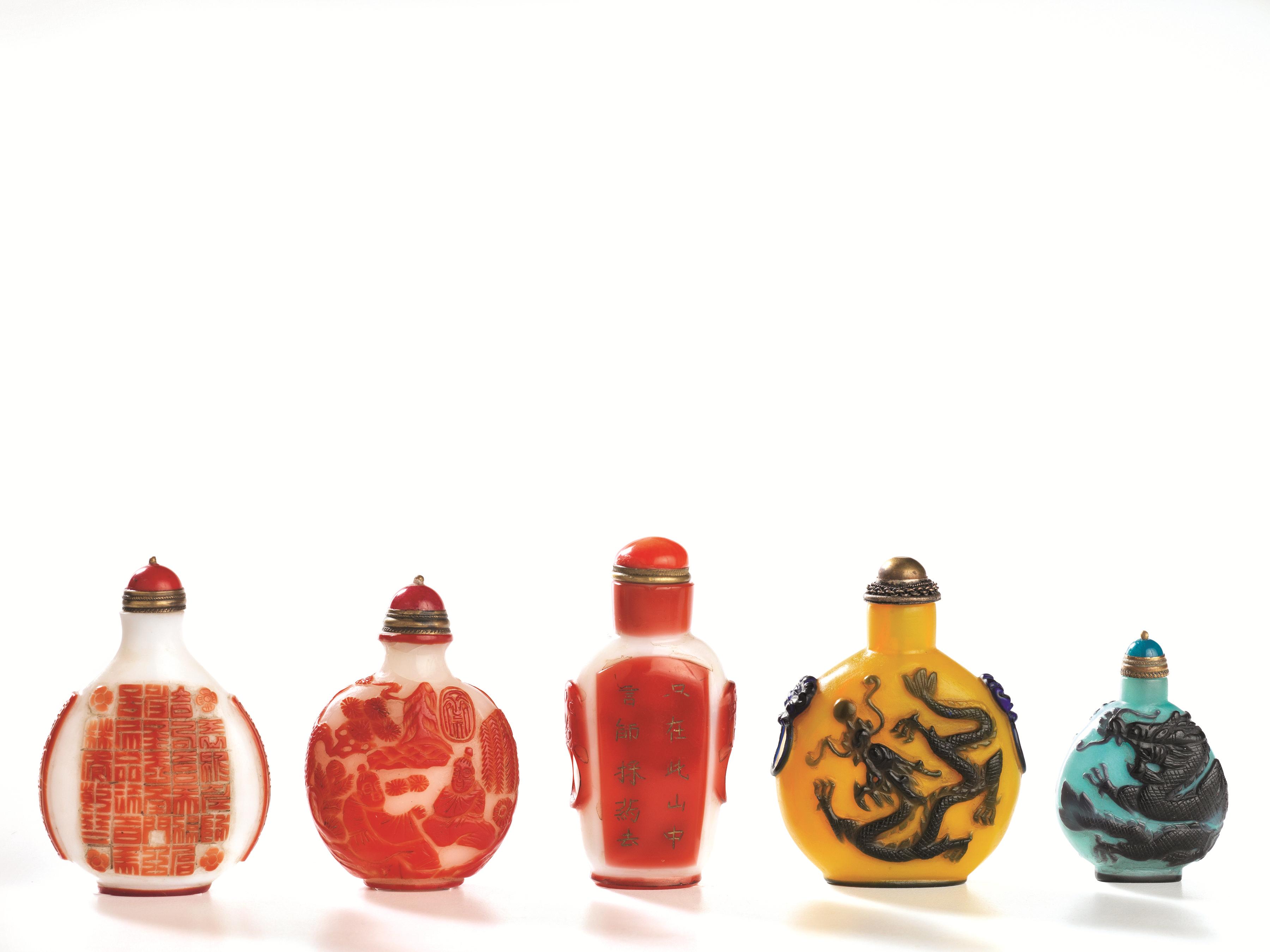 CINQUE SNUFF BOTTLES, CINA, SECC. XIX-XX in vetro incamiciato, decorate con...