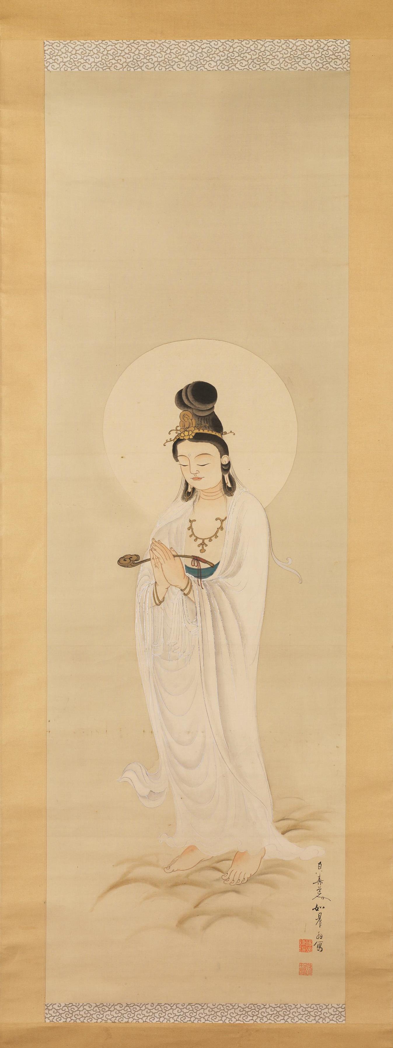 su seta riportata su carta , raffigurante Guanyin stante con scettro , cm 128 x 40