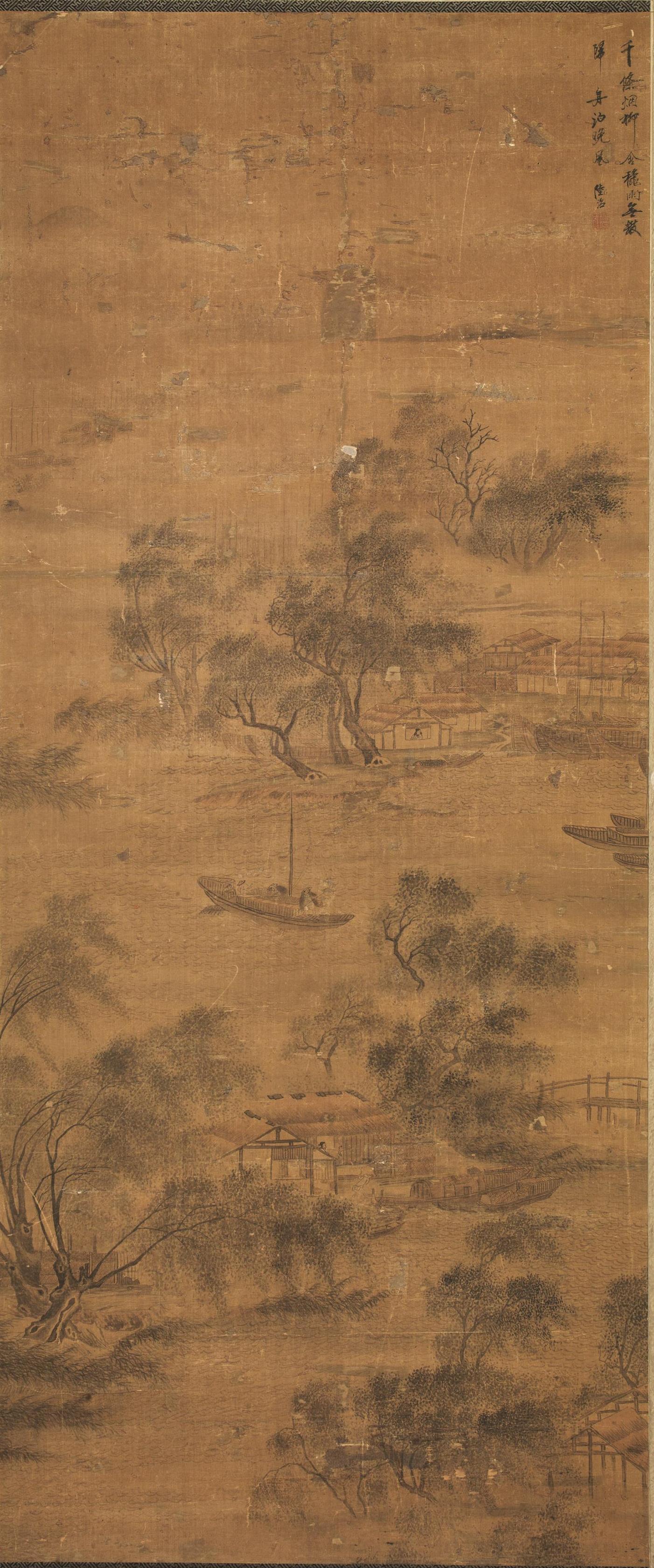 su seta riportata su carta, raffigurante paesaggio fluviale, cm 147x60,5