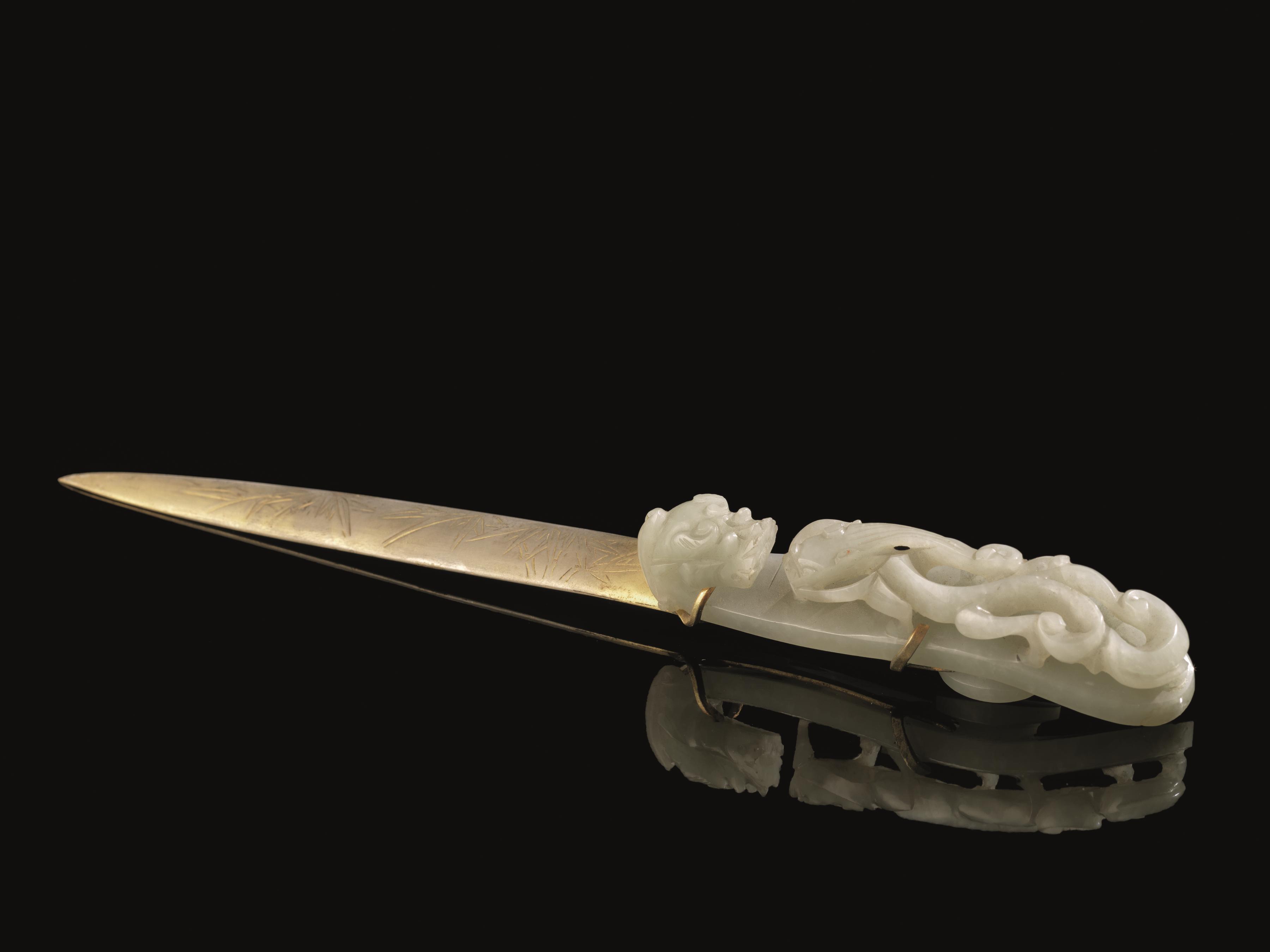TAGLIACARTE, CINA, DINASTIA QING, SEC. XIX con presa in giada verde celadon...