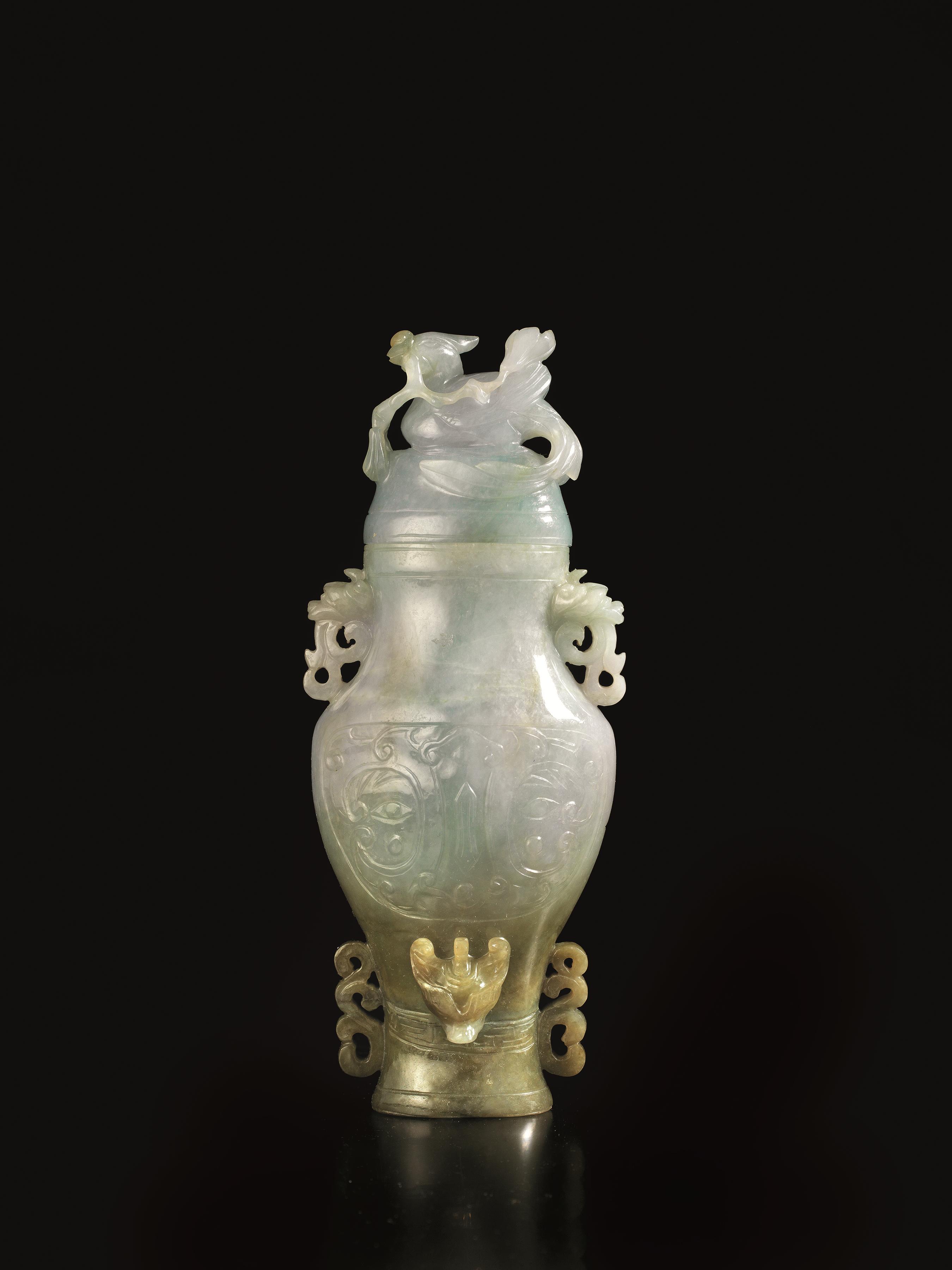 VASO CON COPERCHIO, CINA, SEC. XX in giadeite, con pipistrello alla base e...