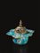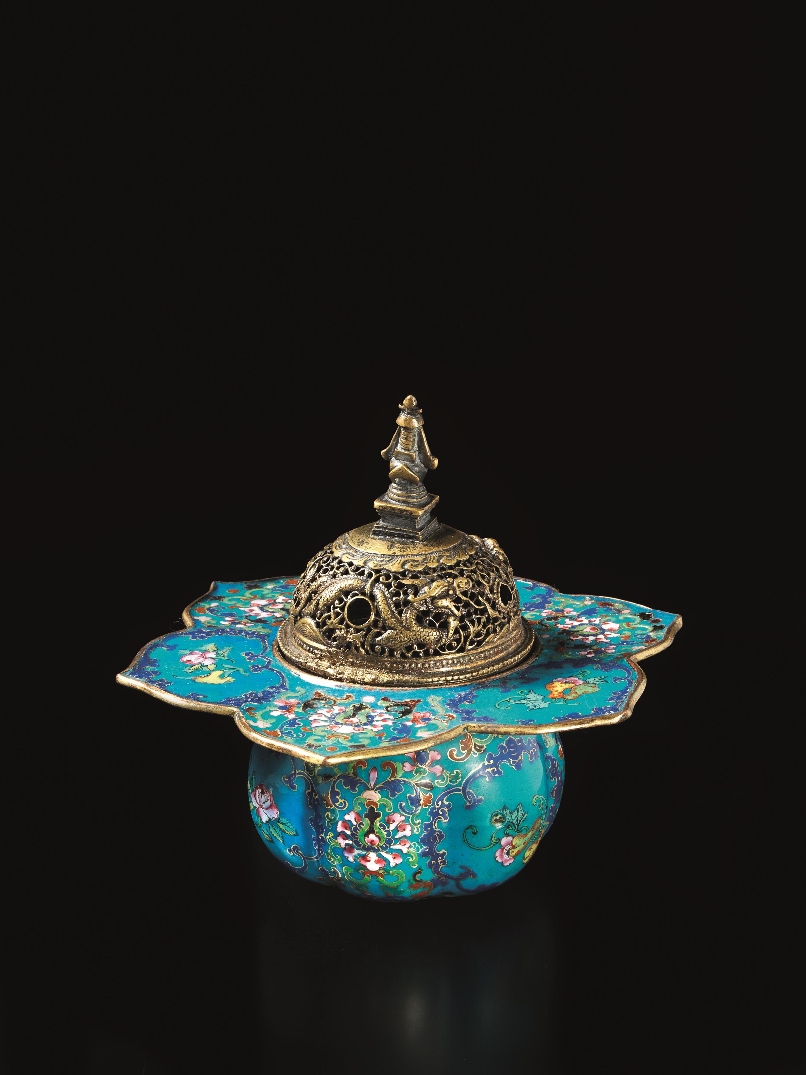 in metallo smaltato, con coperchio in bronzo lavorato al traforo con motivo