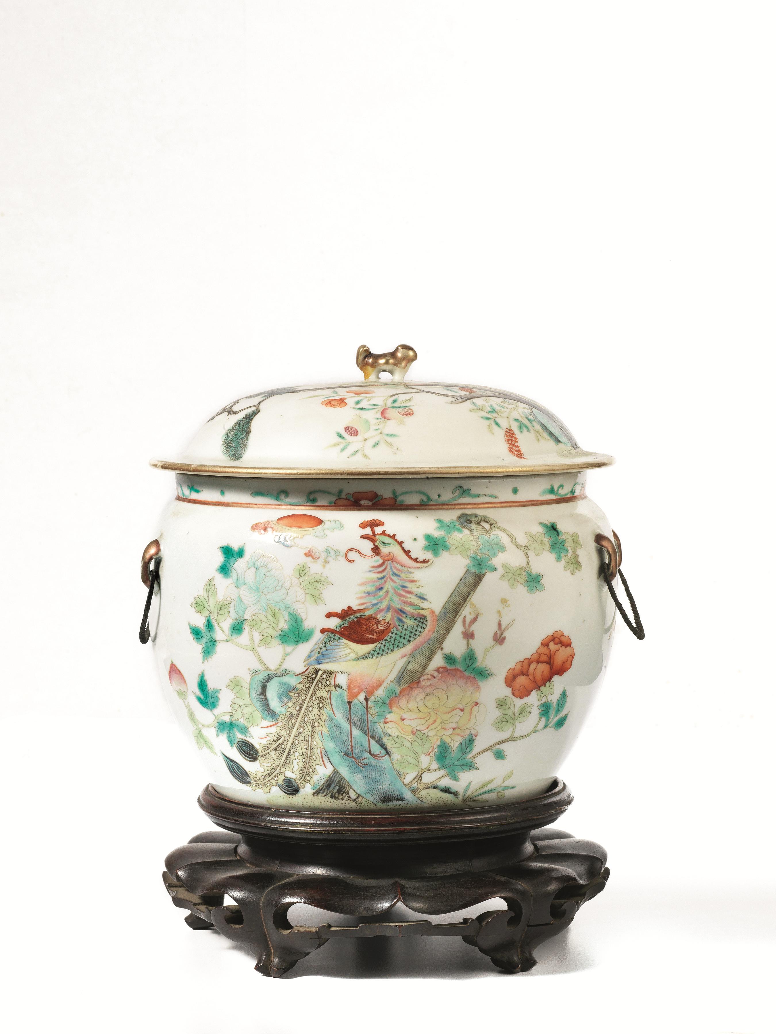 in porcellana policroma, finemente decorato con fenici tra alberi e peonie