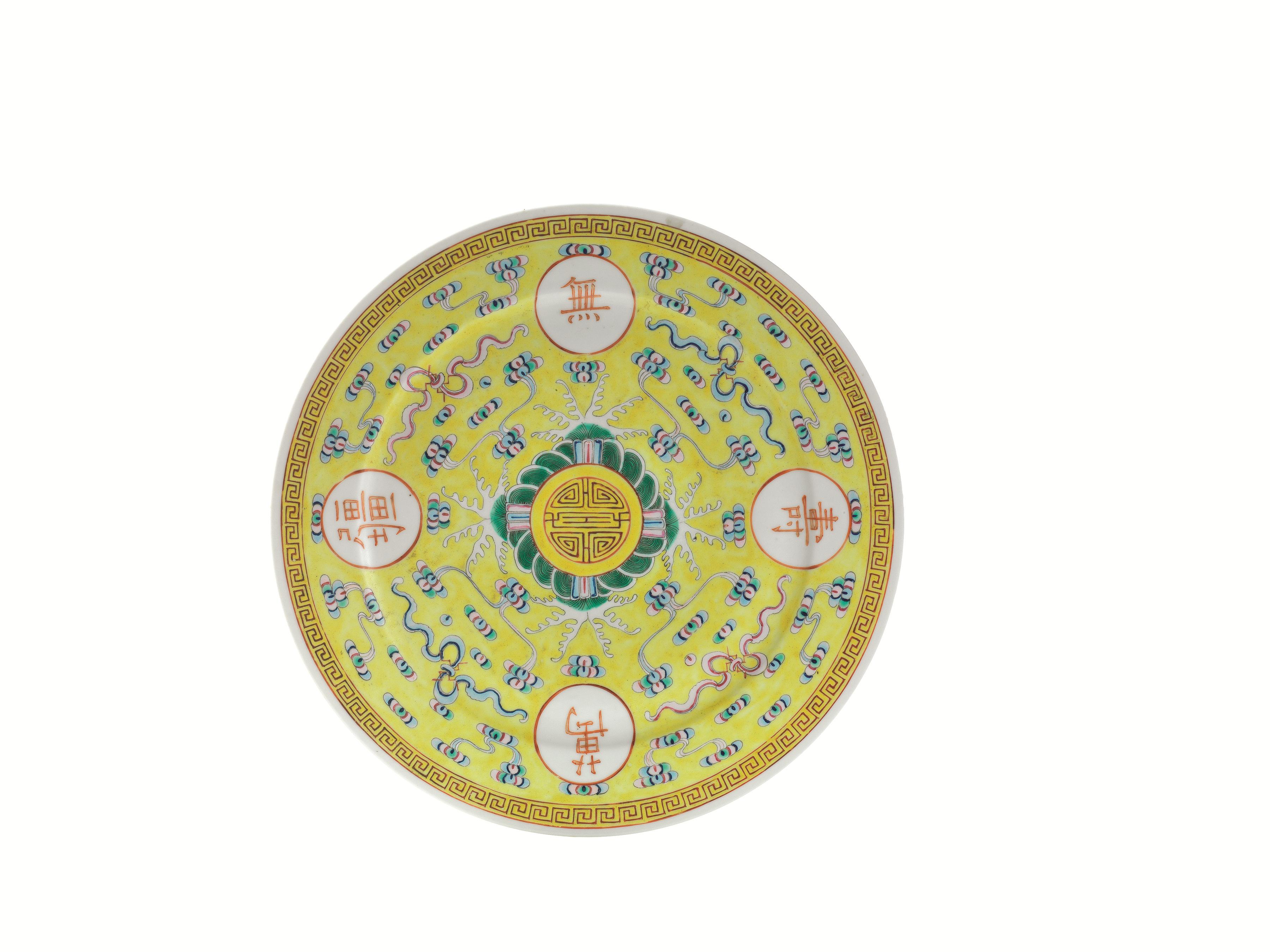in porcellana policroma a fondo giallo, decorato con ideogrammi e motivi