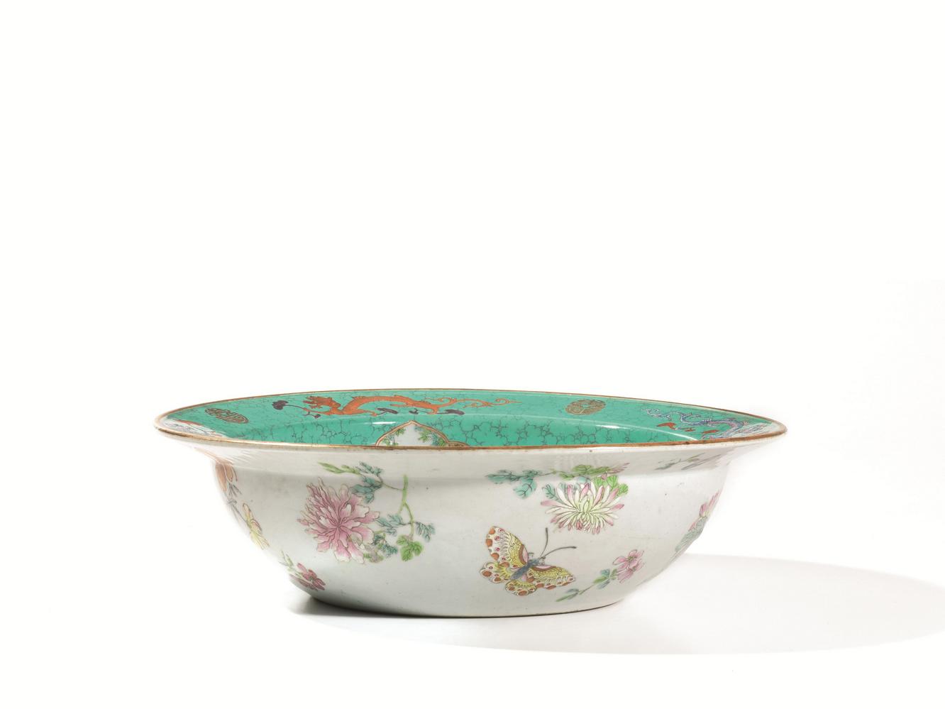 BACILE, CINA, SEC. XIX in porcellana famiglia rosa, il fondo a finta pietra...
