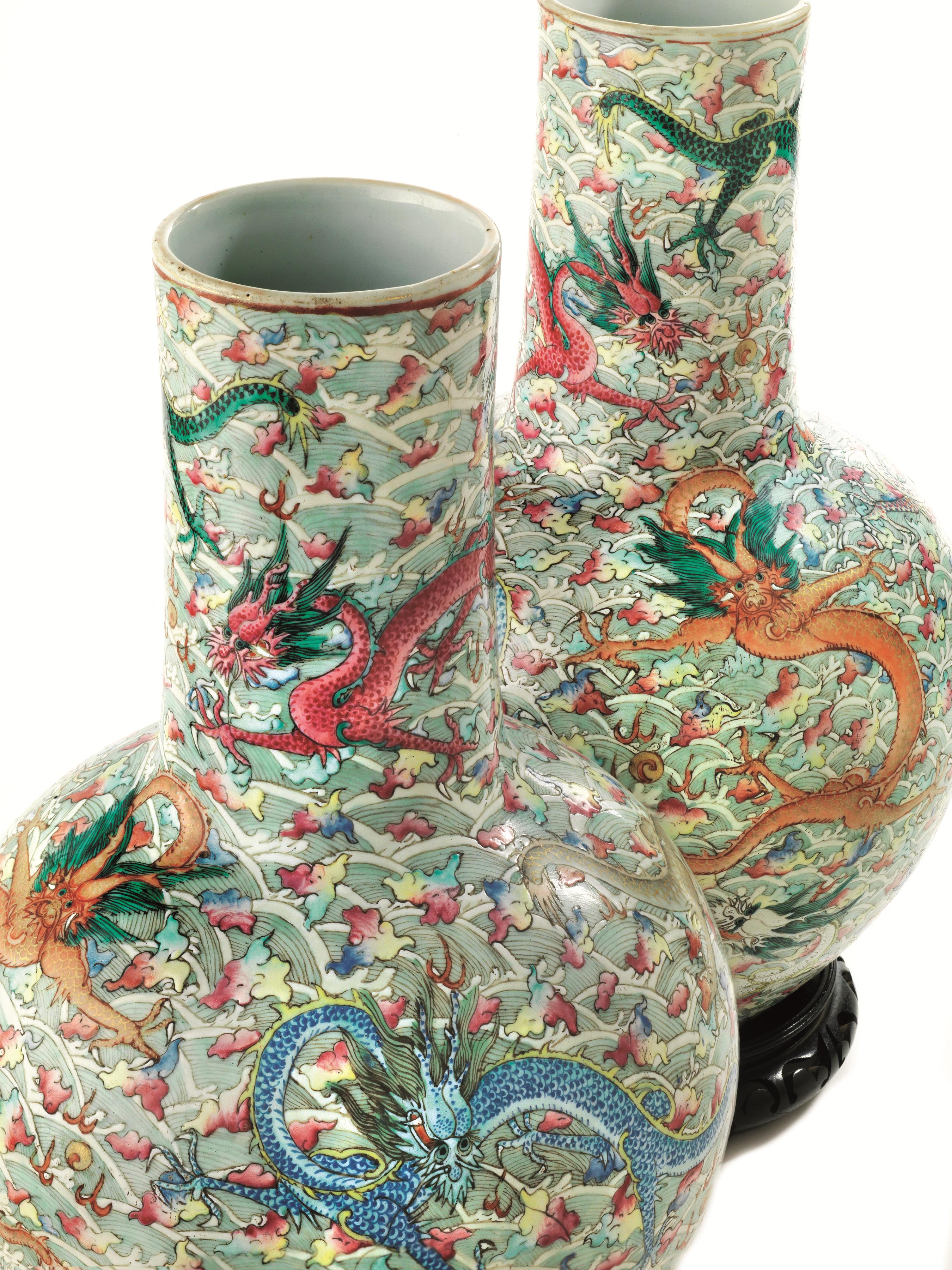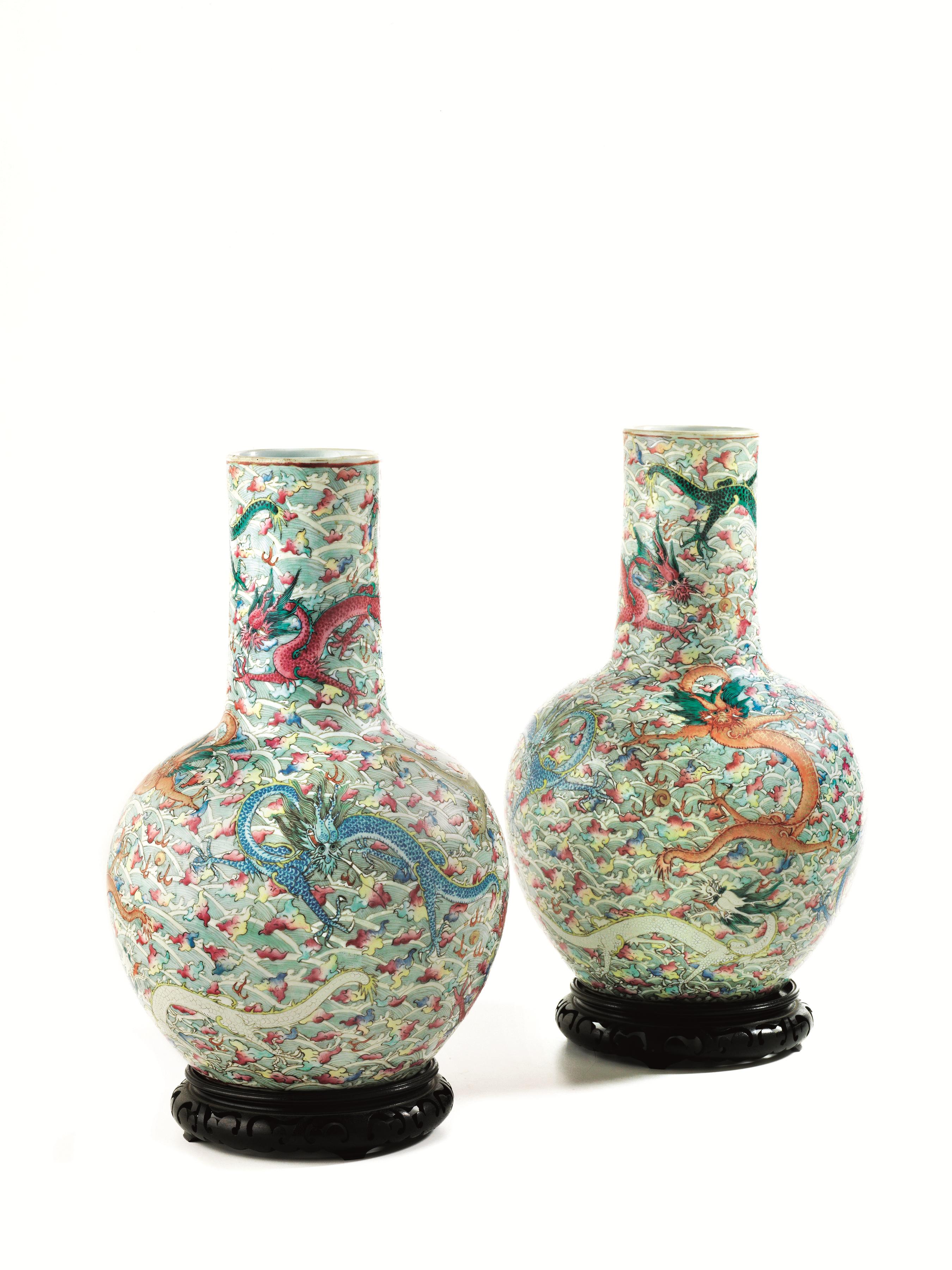 A pair of famille rose "nine dragons" bottle vases, China, 19th -20th