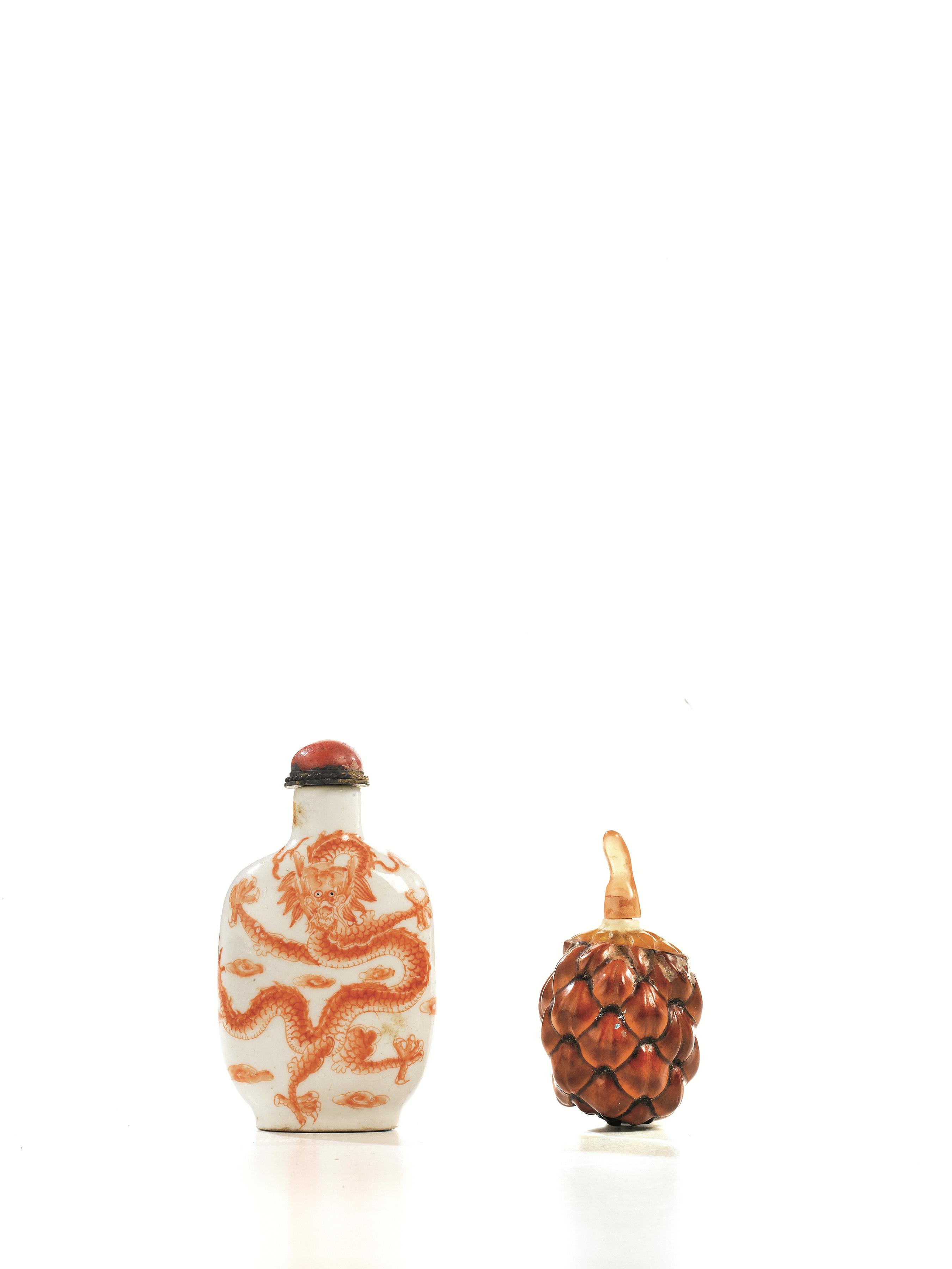 una in porcellana, decorata con un motivo di drago, alt. cm 7.5, l'altra in cocco modellata nella forma di frutto, alt. cm 6