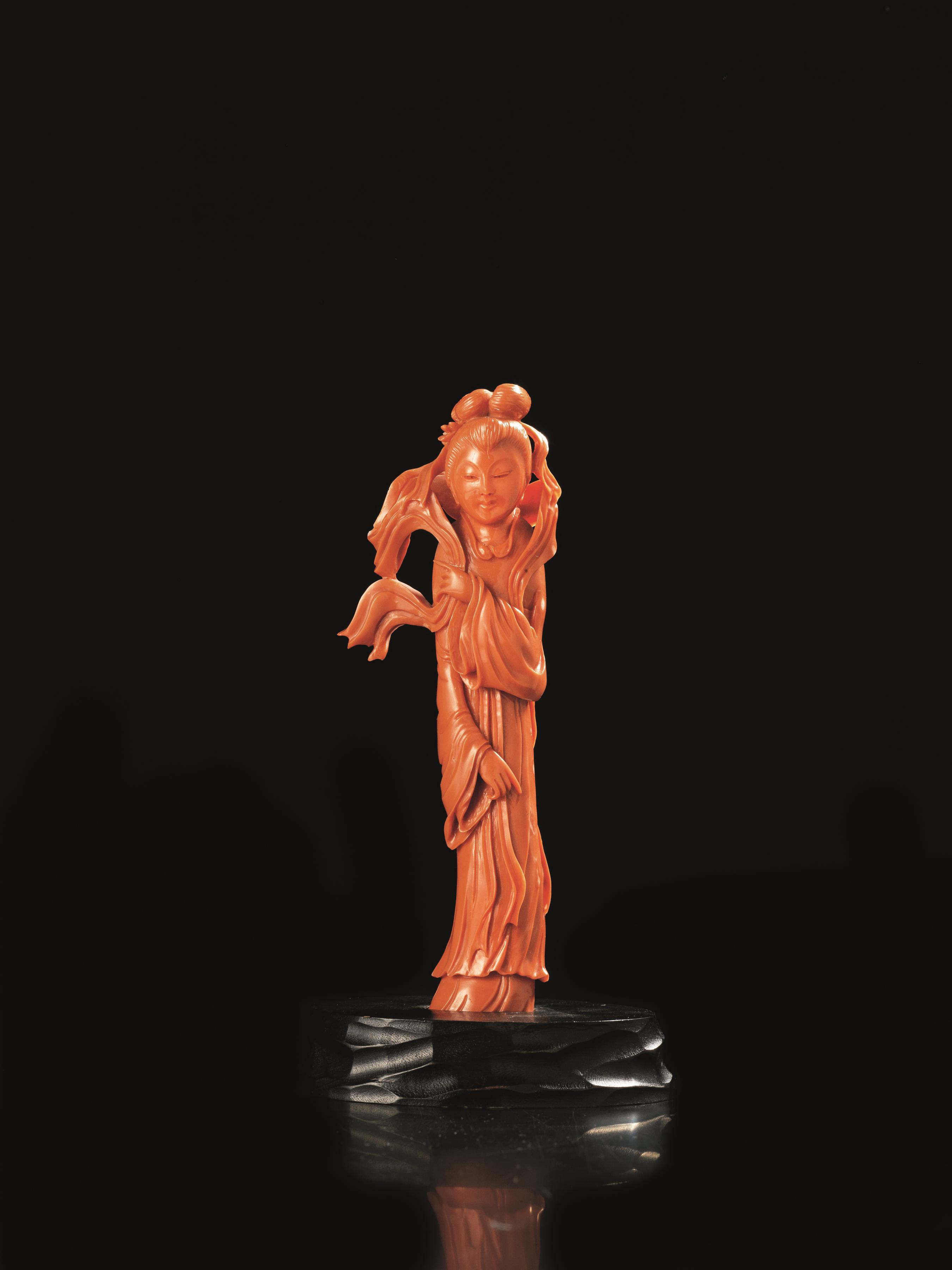 in corallo, raffigurante Guanyin stante elegantemente vestita, alt. cm