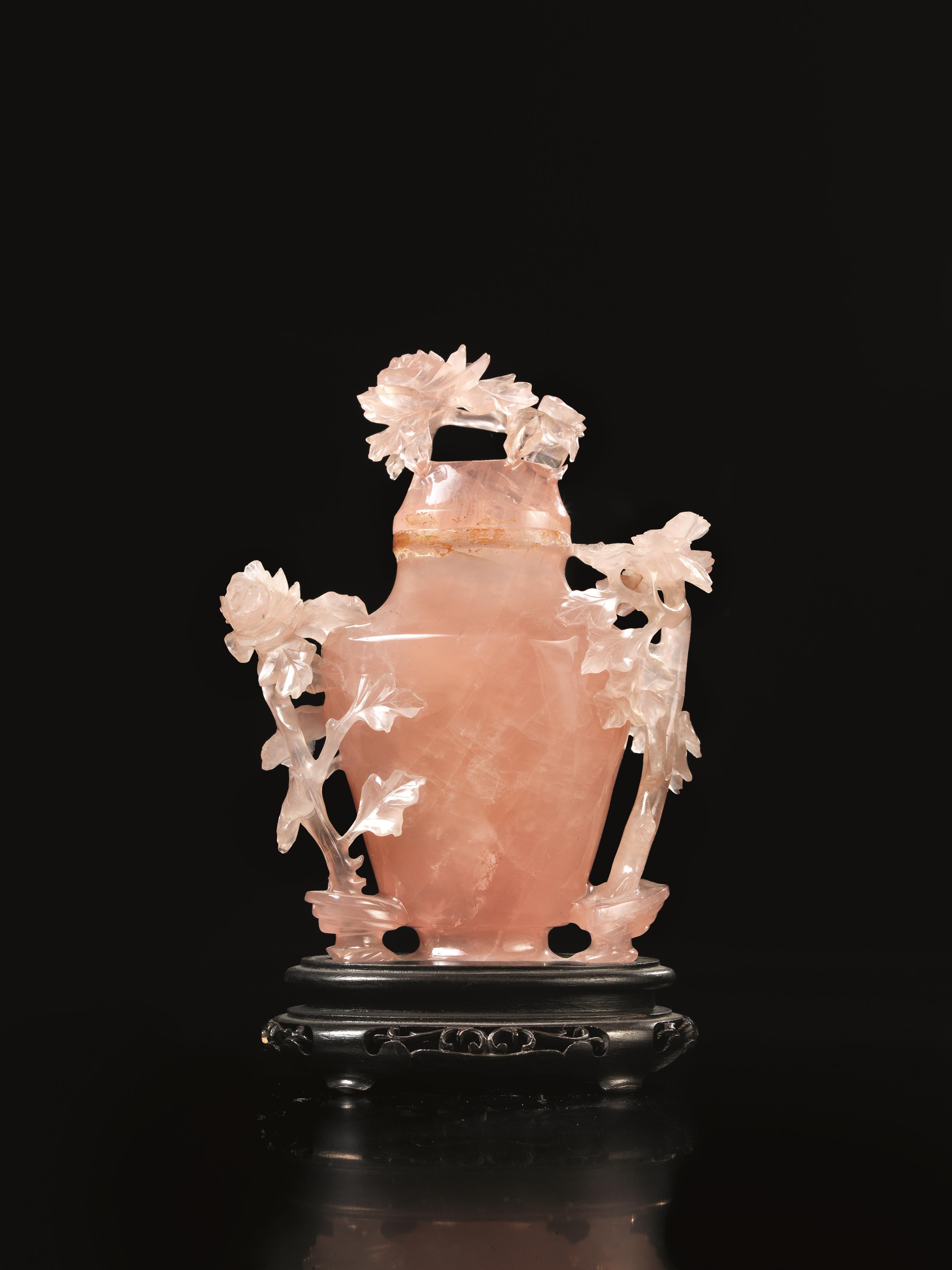 VASO CON COPERCHIO, CINA, SEC. XIX in quarzo rosa, avvolto da rami fioriti,...