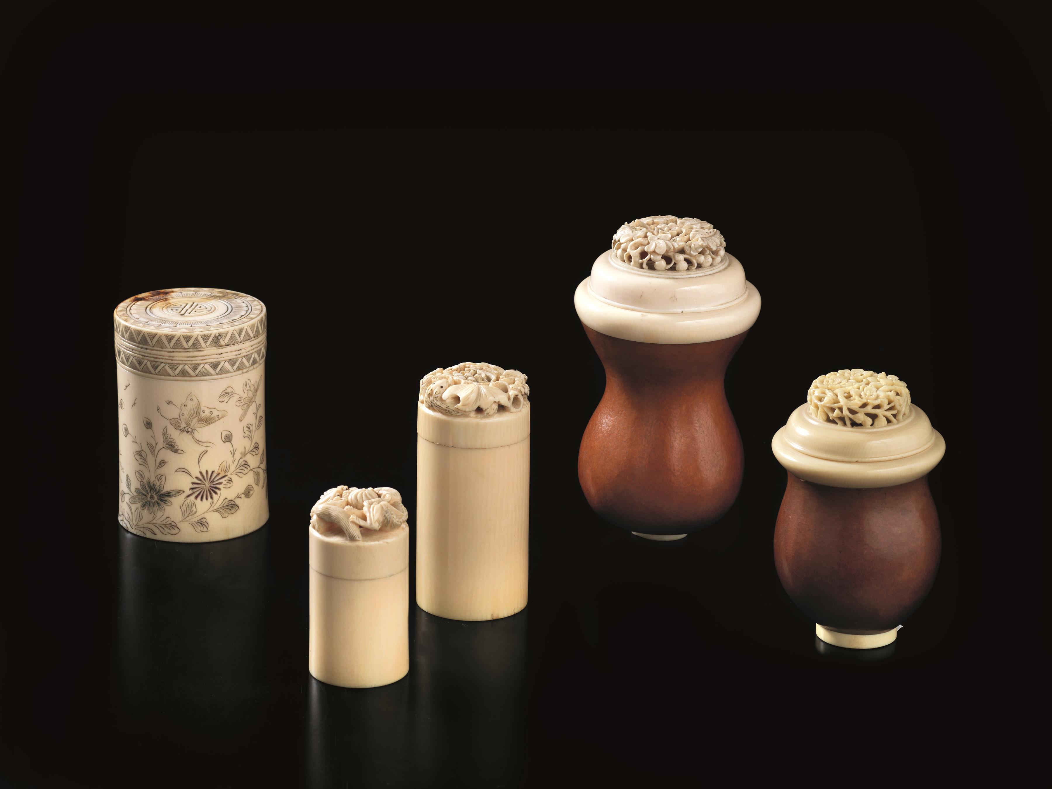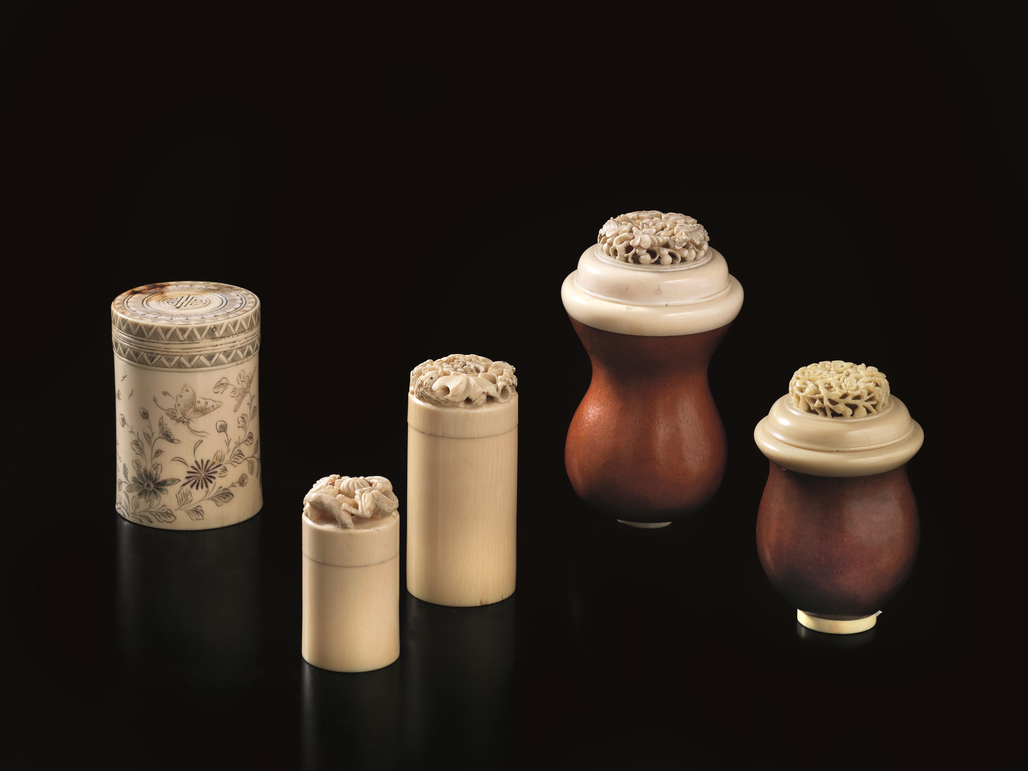 Five cilindric boxes in ivory, China, 19th-20th century