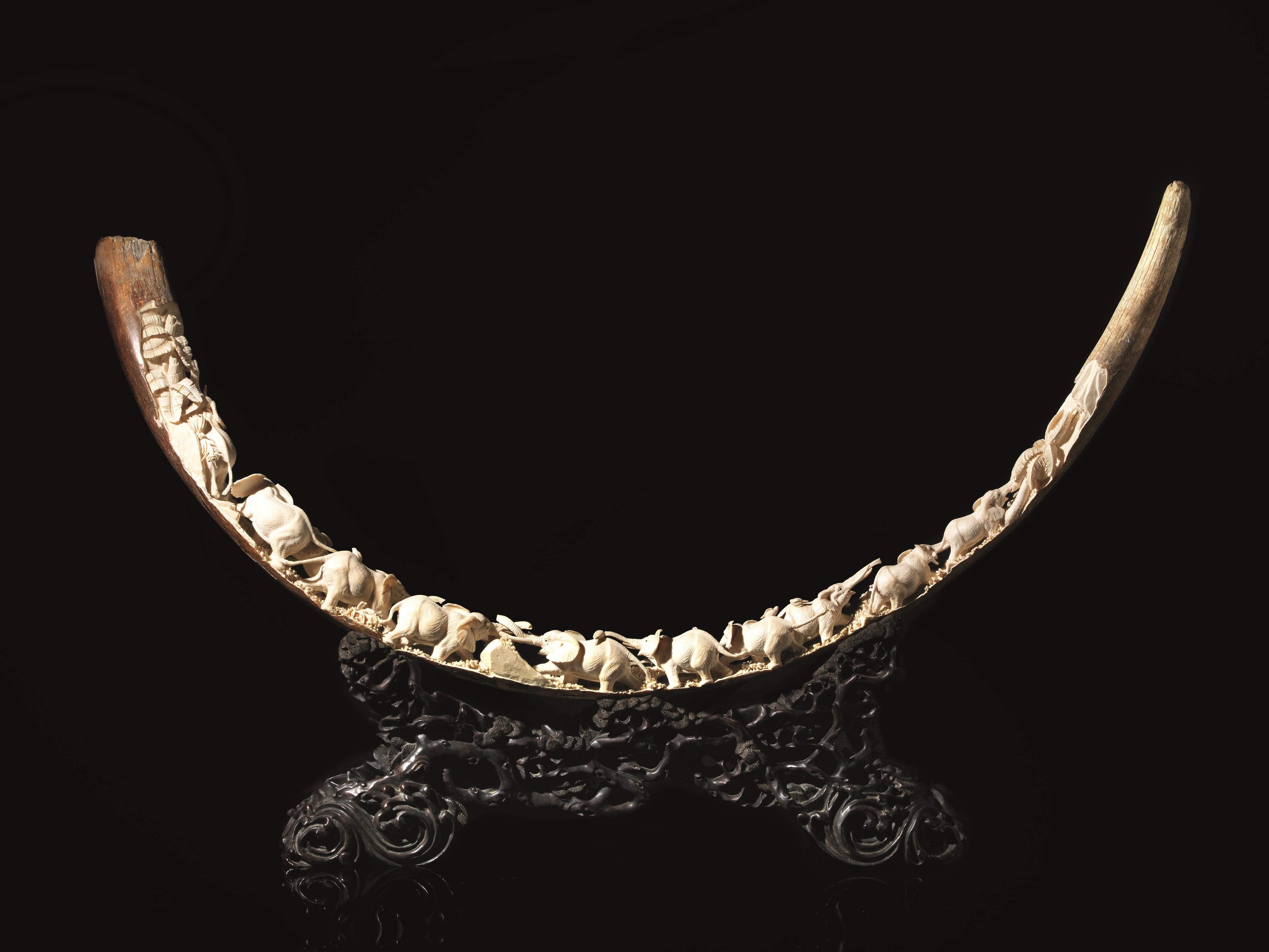 avorio fossile, scolpita ed incisa con elefanti area sud est asiatico, secc. XIX-XX.