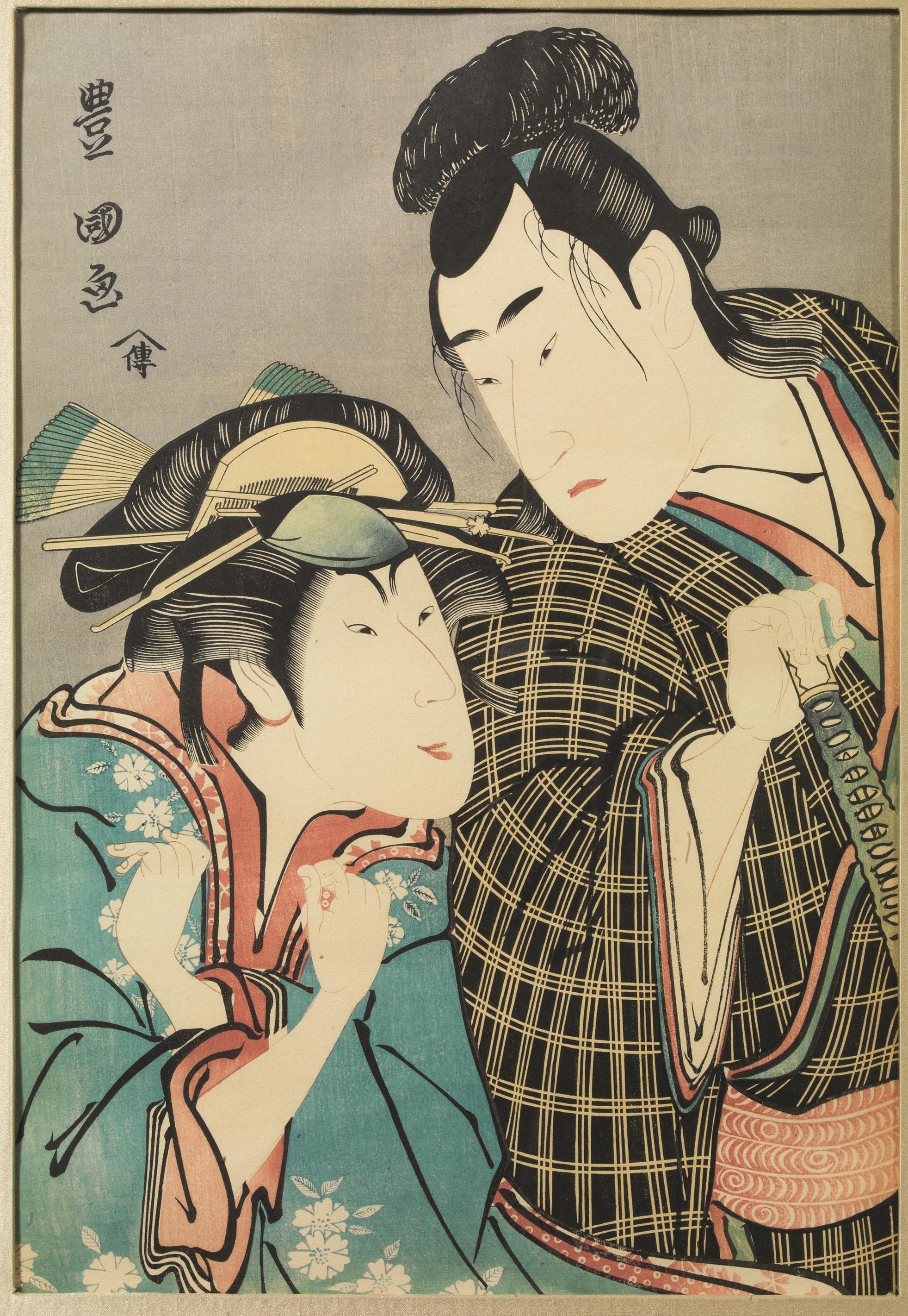 LITOGRAFIA, GIAPPONE, SEC. XX raffigurante un personaggio maschile e uno...
