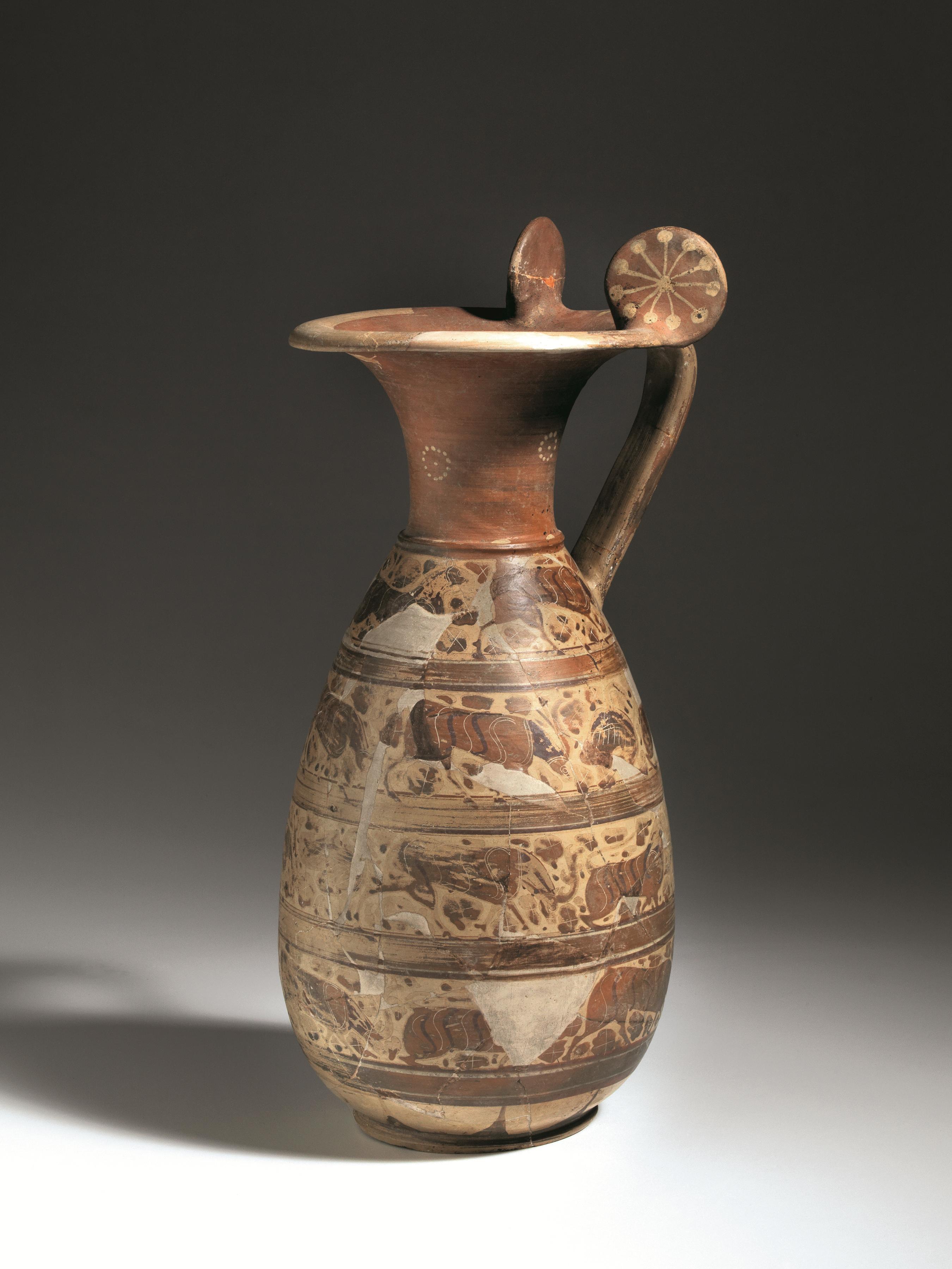 GRANDE OLPE A ROTELLE ETRUSCO CORINZIA Materia e tecnica: argilla figulina...