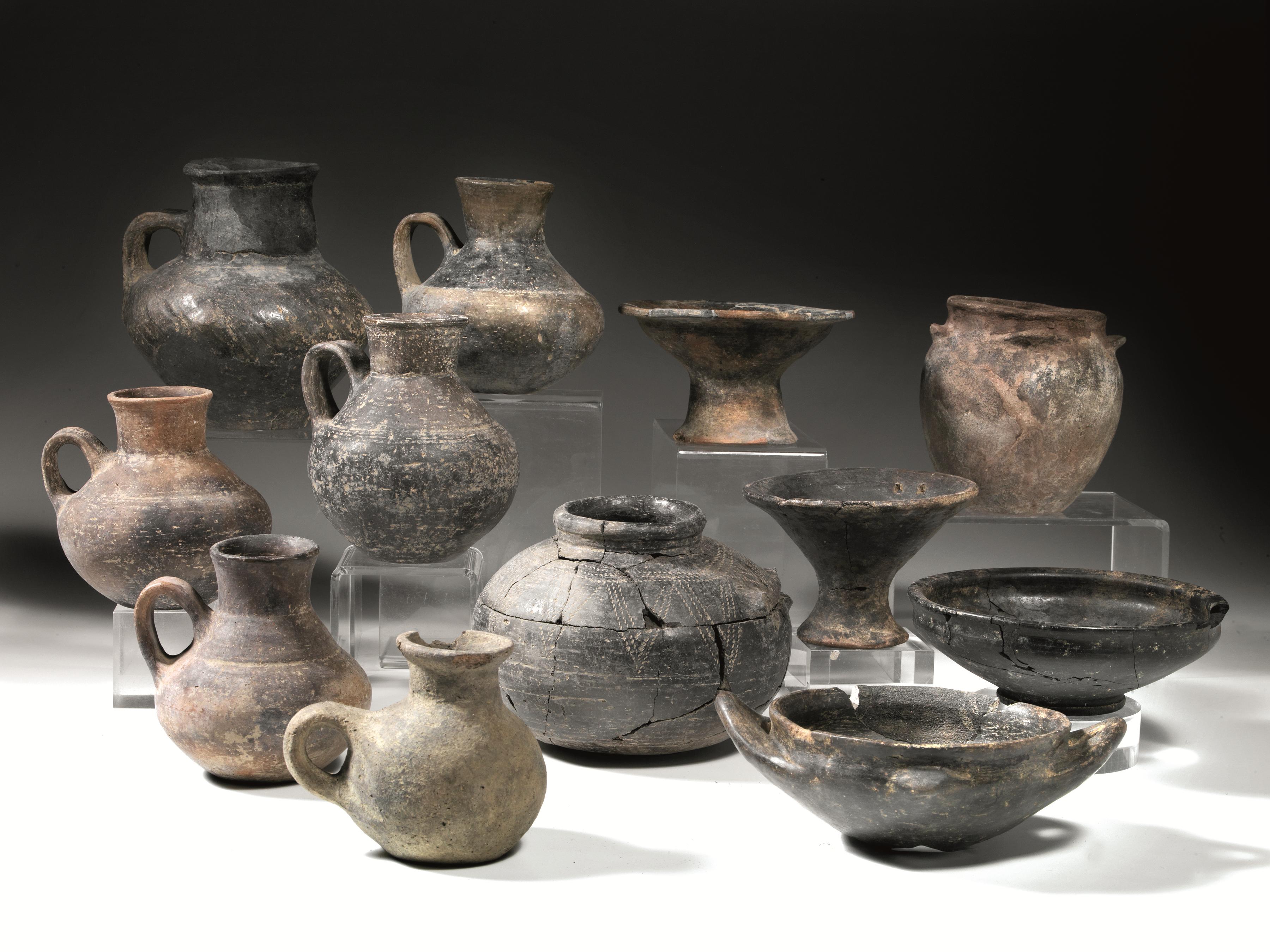 A) Sei brocchette monoansate simili tra loro di con orlo indistinto leggermente svasato, collo cilindrico, spalla obliqua impostata sul corpo globulare schiacciato mediante una carena, fondo piatto, ansa a nastro verticale impostata sulla spalla e la massima espansione; una decorata sulla massima espansione con bugne e solcature oblique; B) due piattelli su piede a tromba con vasca troncoconica, una coppa biansata con anse orizzontali ritorte verso l’alto, vasca troncoconica a fondo piatto; una coppa con orlo appiattito, vasca troncoconica e piede ad anello, un’olletta biansata con orlo ingrossato, corpo globulare schiacciato ai poli decorata a falsa cordicella con triangoli rivolti verso il basso, un olletta con orlo a colletto, corpo ovoide e quattro piccole anse a presa (12)