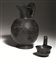 Oinochoe con bocca trilobata, collo cilindrico svasato in alto, corpo quasi sferico, basso piede troncoconico, ansa a triplice bastoncello impostata sul labbro e sulla spalla con due piccoli apici nel punto d’attacco superiore, decorata con sottili linee incise sul ventre; Kyatos con vasca globulare compressa, labbro svasato distinto, piede troncoconico, ansa a nastro ripiegata e sormontante impostata dal labbro alla vasca e collegata mediante un ponticello decorato con una protome maschile all’interno dell’ansa e con denti di lupo sul bordo (2)