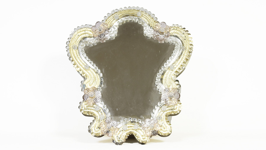 PICCOLA SPECCHIERA IN VETRO SOFFIATO forma sagomata decorata con motivi floreali nei toni del rosa cm 33,5x30 BLOWN GLASS MIRROR