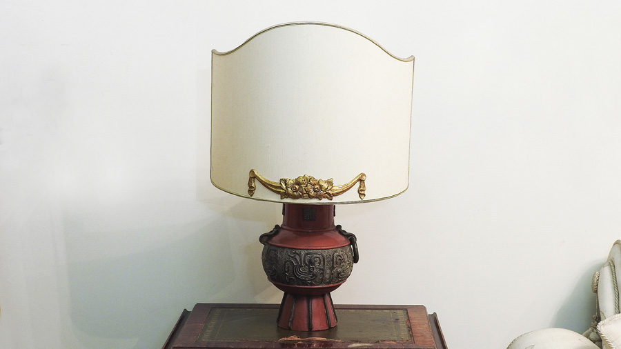 LUME DA TAVOLO IN TERRACOTTA SMALTATA ROSSA Manifattura Zaccagnini corpo globulare con fascia decorata con greche e disegni fantastici, corredato da paralume, difetti e mancanze h cm 31 Glazed Terracotta TABLE LAMP, MANIFATTURA ZACCAGNINI
