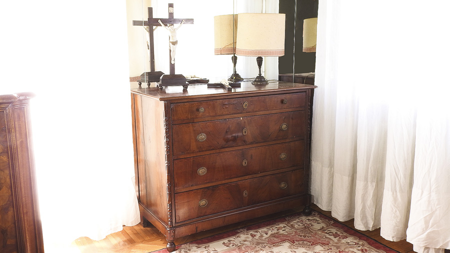 CASSETTONE IMPIALLACCIATO IN PIUMA DI NOCE metà del XIX secolo intarsiato con filettature in legni di frutto, un cassetto nella fascia e tre sottostanti, lesene laterali tornite, piedi anteriori a palla, difetti h cm 101,5x126x58,5 WANUT VENEERED CHEST OF DRAWERS, MID 19TH CENTURY