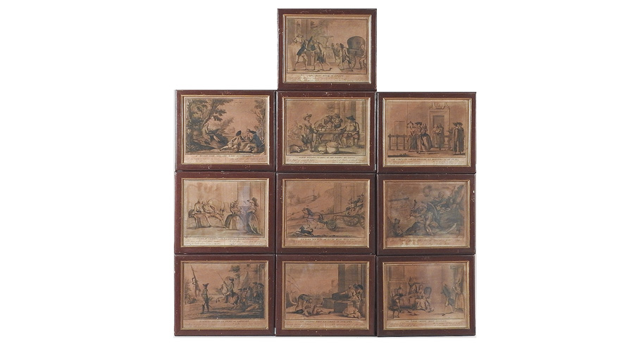 GIUSEPPE PIATTOLI (1743-1823) Proverbi toscani 1788 serie di dieci incisioni, in cornice difetti cm 21x27,5 TUSCAN PROVERBS, TEN ENGRAVINGS