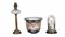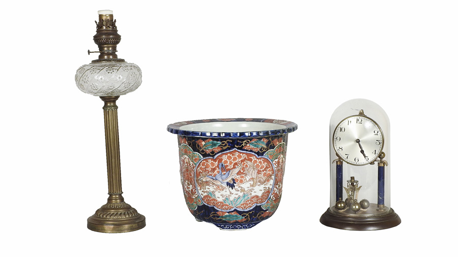 LOTTO orologio da tavolo entro campana in vetro, portavasi in porcellana orientale e lume ad olio in metalo, fusto a colonna, elettrificato, difetti (3)