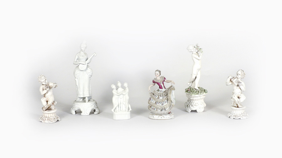 SEI FIGURE IN PORCELLANA E BISCUIT tra cui una coppia di puttini, una damina...