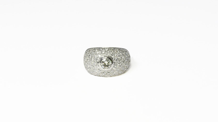 ANELLO IN ORO BIANCO A FASCIA BOMBATA con pavé di diamanti e diamante centrale diamanti pavé ct 1,30 circa, diamante centrale ct 0,60 circa, gr 17 WHITE GOLD AND DIAMOND RING