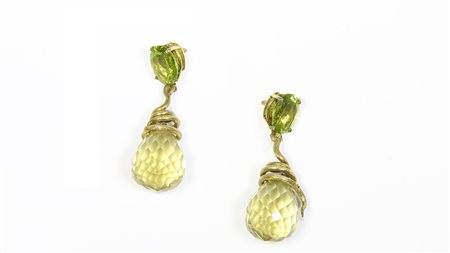 PAIO DI ORECCHINI PENDENTI IN ORO GIALLO SATINATO CON PERIDOTI E QUARZI PRASI...