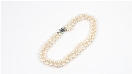 COLLANA A DUE FILI DI PERLE SEMIBAROCCHE con fermezza in oro bianco, zaffiro e diamanti taglio huit/huit diametro perle 9/9,5 mm. TWO SEMIBAROQUE CULTURED PEARLS STRANDS NECKLACE WITH A WHITE GOLD, SAPPHIRE AND DIAMONDS CLASP