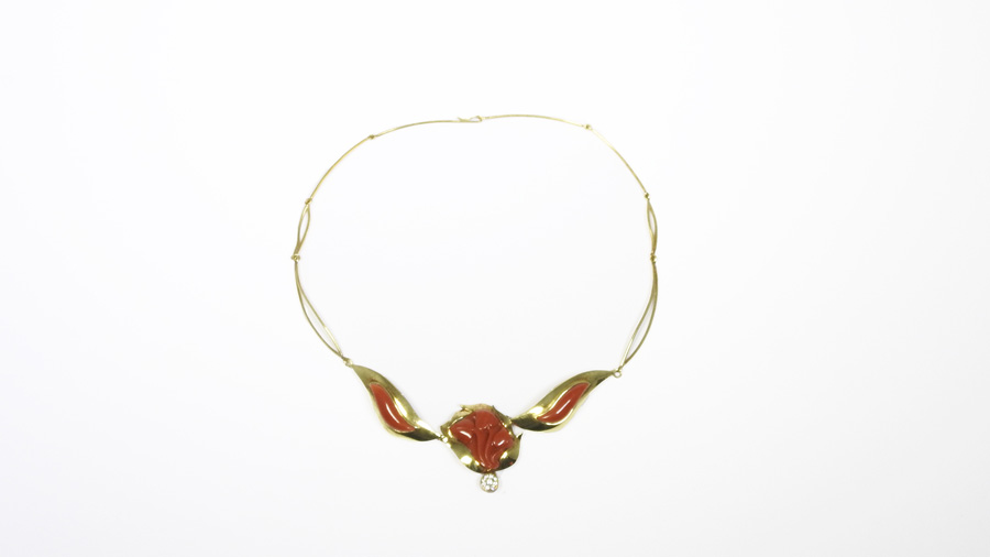 COLLANA IN ORO E CORALLO, realizzata con tre placchette centrali impreziosite da corallo lavorato e piccolo pendente rotondo in brillanti gr 43,4 GOLD AND CORAL NECKLACE