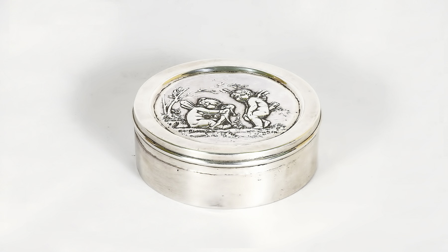 SCATOLA ROTONDA IN ARGENTO Goldsmiths&Silversmiths Co. Ltd, Londra, 1900 inglese coperchio sbalzato con puttini gr 115 ROUND SILVER BOX, GOLDSMITHS&SILVERSMITHS CO. LTD, LONDON, 1900
