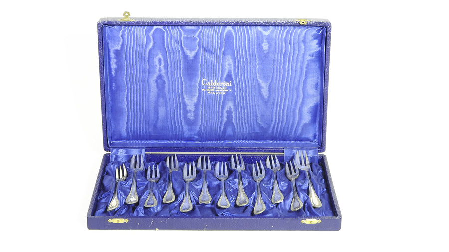 SERIE DI DODICI FORCHETTINE DA DOLCE IN ARGENTO Milano, Calderoni entro scatola originale in pelle blu gr 370 A SET OF TWELVE SILVER PASTRY FORKS, MILAN, CALDERONI
