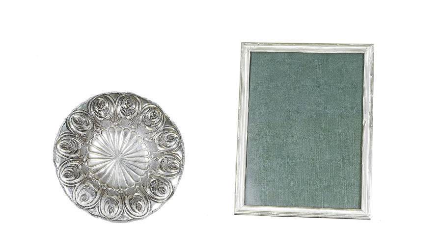 LOTTO UNA COPPETTA IN ARGENTO sbalzata con palmette su tre piedini a zampa ferina ed unacornice portaritratti rivestita in argento, lievi difetti gr netti 190 (2)