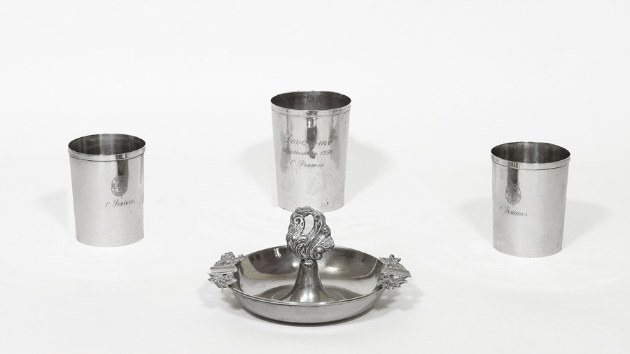 LOTTO DI OGGETTI IN ARGENTO composto da un portacenere e tre bicchieri trofeo, difetti gr 580 (4)